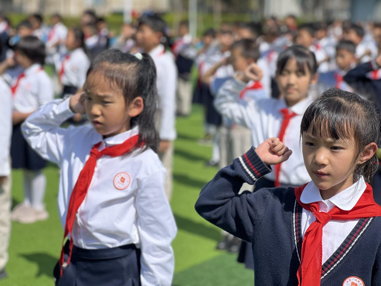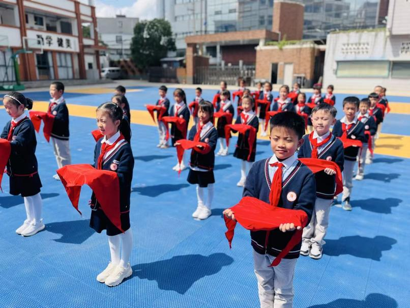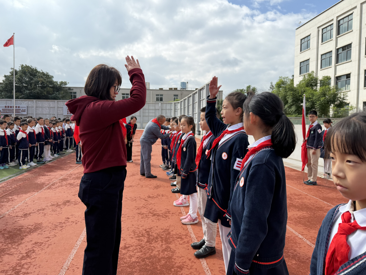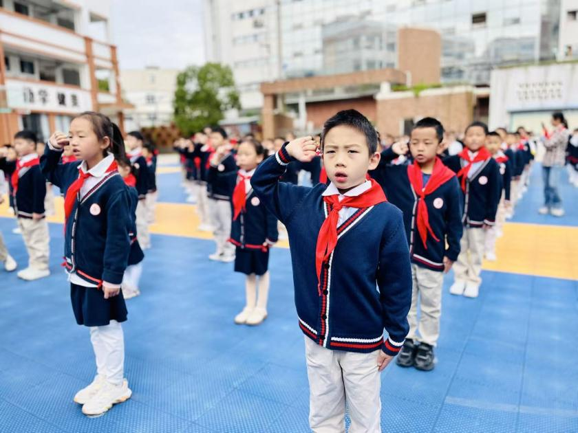 文昌校区举行了新队员入队仪式。活动包括出队旗、齐唱《中国少年先锋队队歌》,辅导员与老队员为新队员佩戴红领巾等环节。新队员在队旗下庄重宣誓,全体队员在辅导员的带领下高声呼号“时刻准备着”,以实际行动传承和践行少先队的光荣传统。