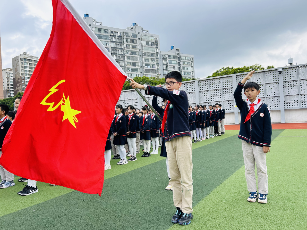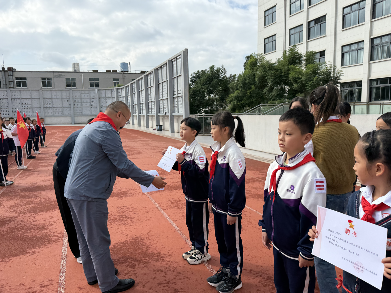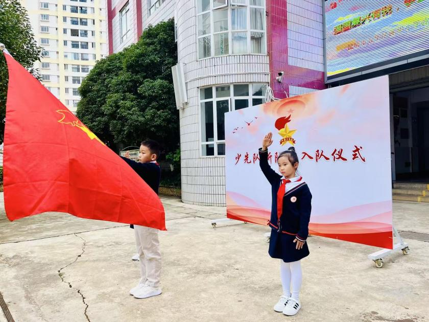 文昌校区举行了新队员入队仪式。活动包括出队旗、齐唱《中国少年先锋队队歌》,辅导员与老队员为新队员佩戴红领巾等环节。新队员在队旗下庄重宣誓,全体队员在辅导员的带领下高声呼号“时刻准备着”,以实际行动传承和践行少先队的光荣传统。