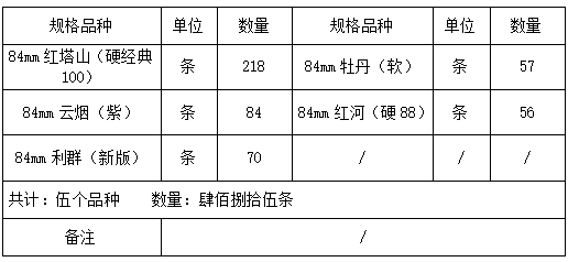 2025年10月17日,我局执法人员在昆明市呈贡区王家营彩龙街中铁新力物流园外围9-12号华红物流有限公司查获卷烟84mm红塔山(硬经典100)218条、84mm云烟(紫)84条、84mm利群(新版)70条、84mm牡丹(软)57条、84mm红河(硬88)56条,共计5个品种485条,并依法予以先行登记保存。