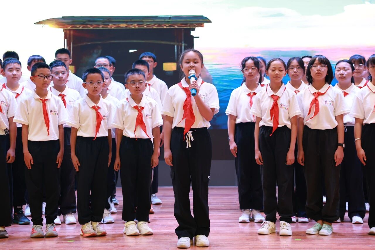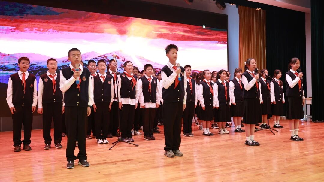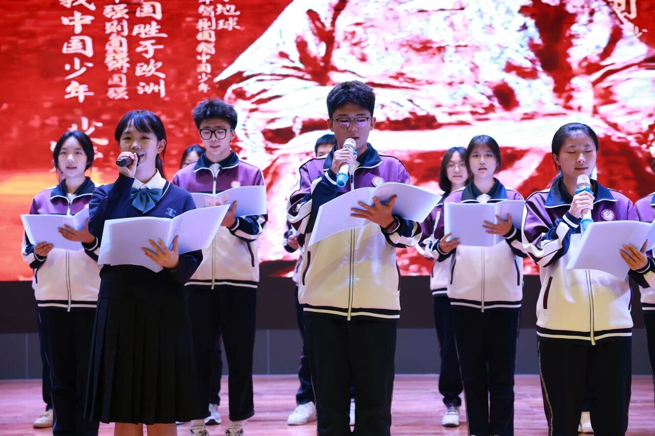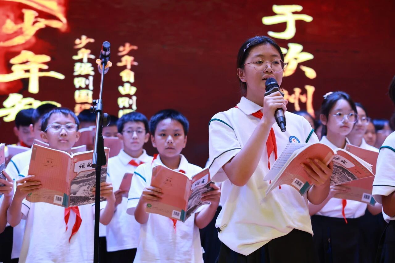 透过历史的眼眸,我们站在岁月的肩膀上远眺。同学们以朝气蓬勃的神态诵读经典。他们的声音时而沉稳如历史回响,时而激昂似时代号角,将《少年中国说》中的豪情与期许演绎得淋漓尽致,尽显中国少年风采。
