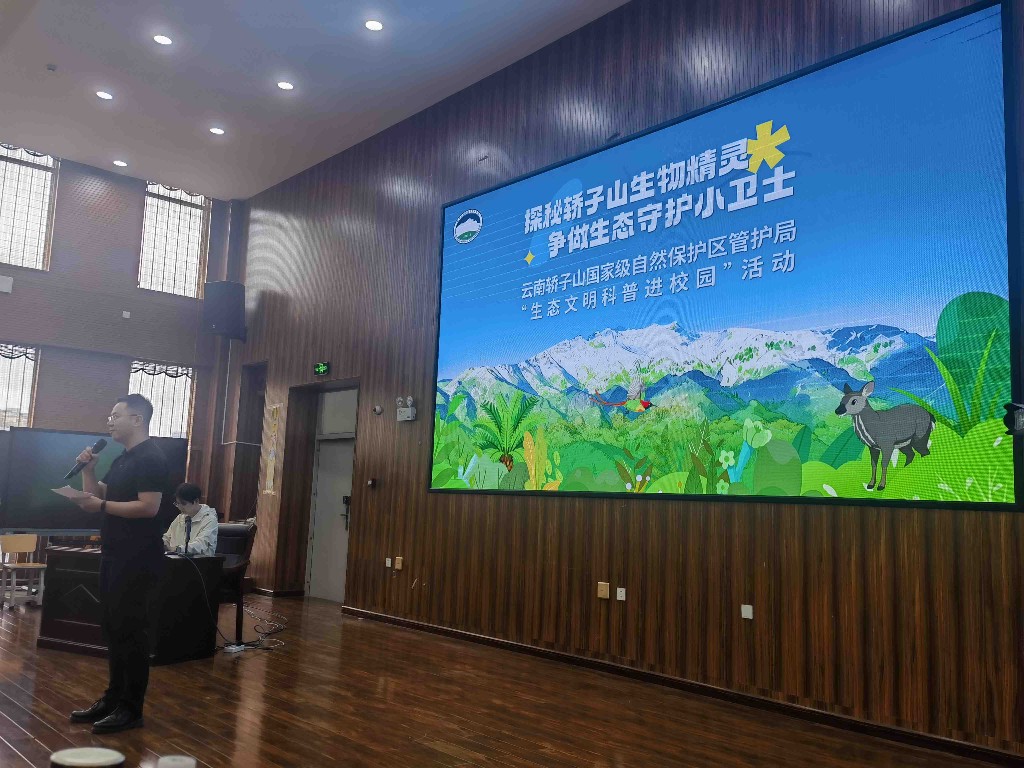 17日上午10时云南轿子山国家级自然保护区科研所高级工程师李子光老师,以一堂生动详实的科普讲座拉开了活动序幕。他运用通俗易懂的语言和真实案例,深入浅出地讲解轿子山的珍稀动植物及其保护价值,极大激发了同学们的好奇心与探索欲,现场不时响起阵阵惊叹与掌声。互动问答环节,昆明市林草局的陈美静老师,带来了趣味有奖问答互动,将活动气氛推向高潮。“林麝属国家几级保护动物?”“国家一级保护动物。”,“须弥红豆杉属国家几级保护植物?”“国家一级保护植物。”面对陈老师抛出的问题,同学们踊跃作答,在一来一往的互动中,深化了对知识的理解,更让生态意识悄然萌芽。