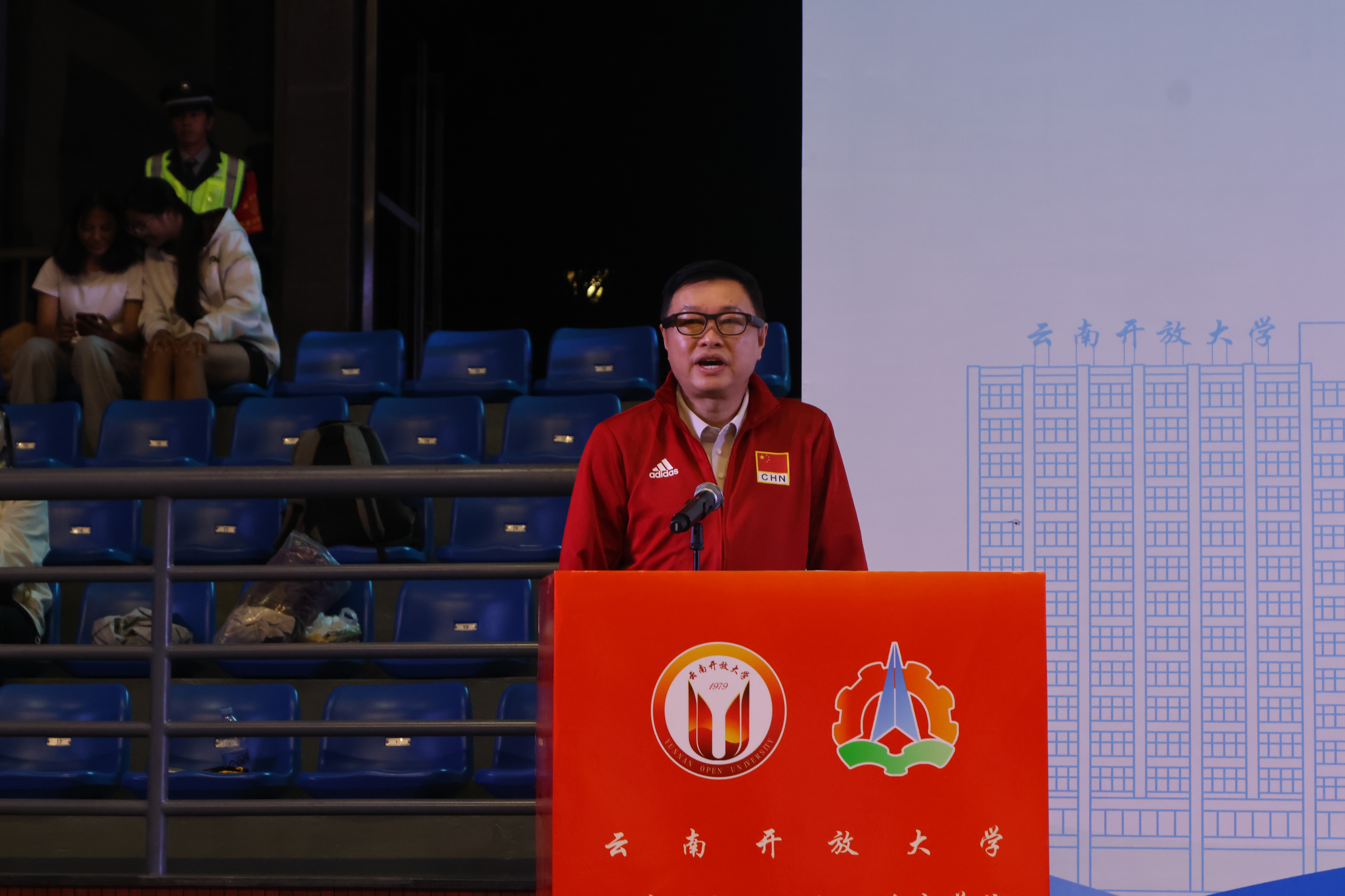 云南开放大学校长于干千致开幕辞。他代表学校对运动会的举办表示祝贺,并向所有参与者和支持单位表示感谢。于干千指出,本届运动会是全省开放教育体系增进交流、深化情感的重要桥梁,旨在推动各办学单位成为更为紧密的事业共同体、情感共同体和命运共同体。他强调,运动场是涵养团结奋斗、勇毅争先改革精神的重要课堂,也是践行德才兼备、体魄健全育人理念的生动实践。最后,他希望全体参赛人员能将赛场上的拼搏精神,转化为推动终身教育体系构建和开放教育改革发展的实际行动,为建设学习型社会贡献力量。