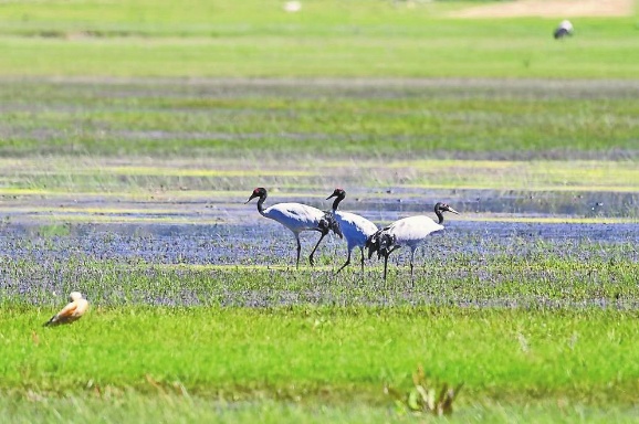 成群的水鸟轻捷地掠过湖面,它们时而扎入水中觅食,时而相互嬉戏玩闹;在清澈浅透的湖水里,白色的海菜花随着波纹轻轻摇曳,嫩黄的花蕊点缀其中……【点击观看视频】