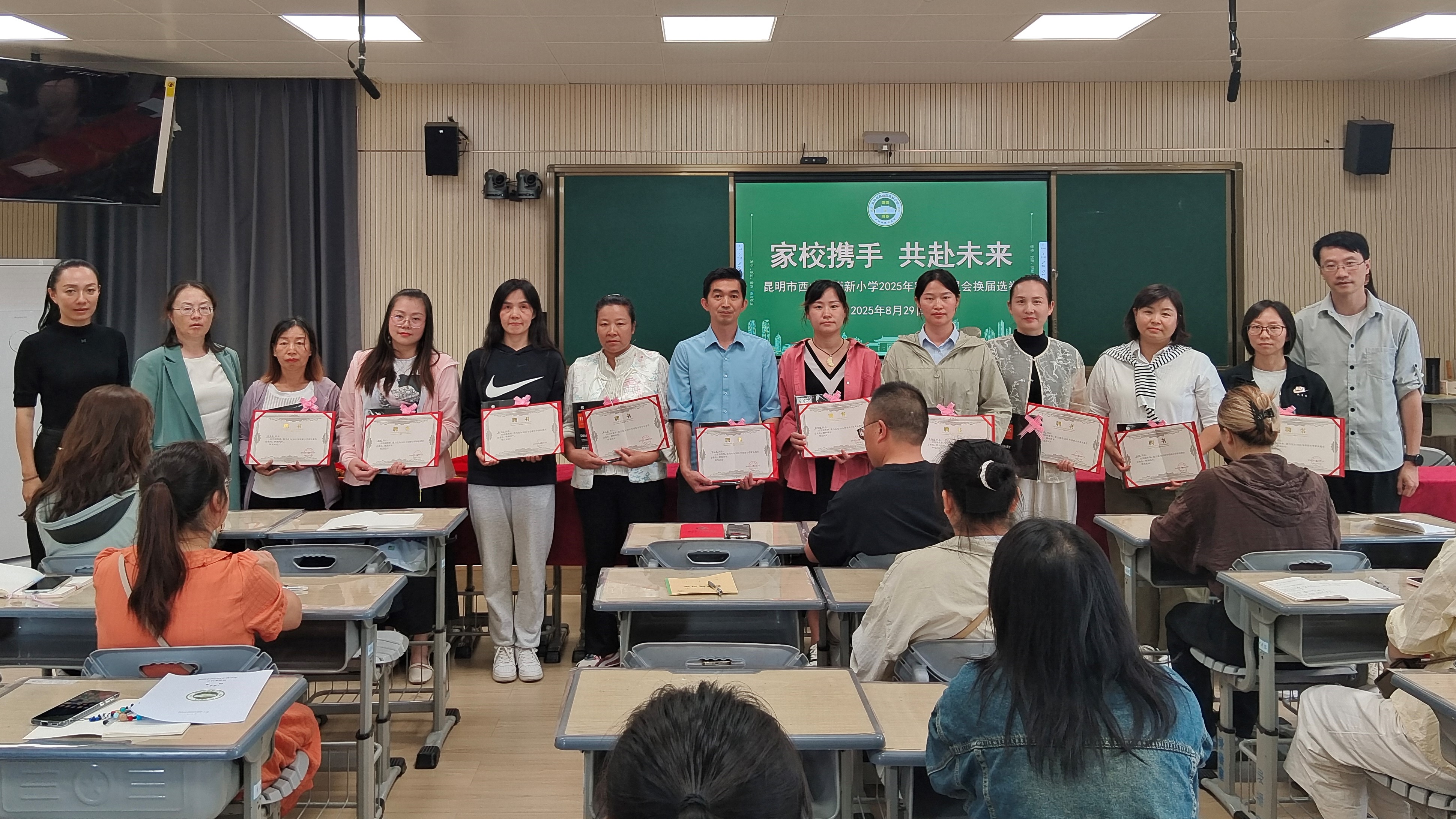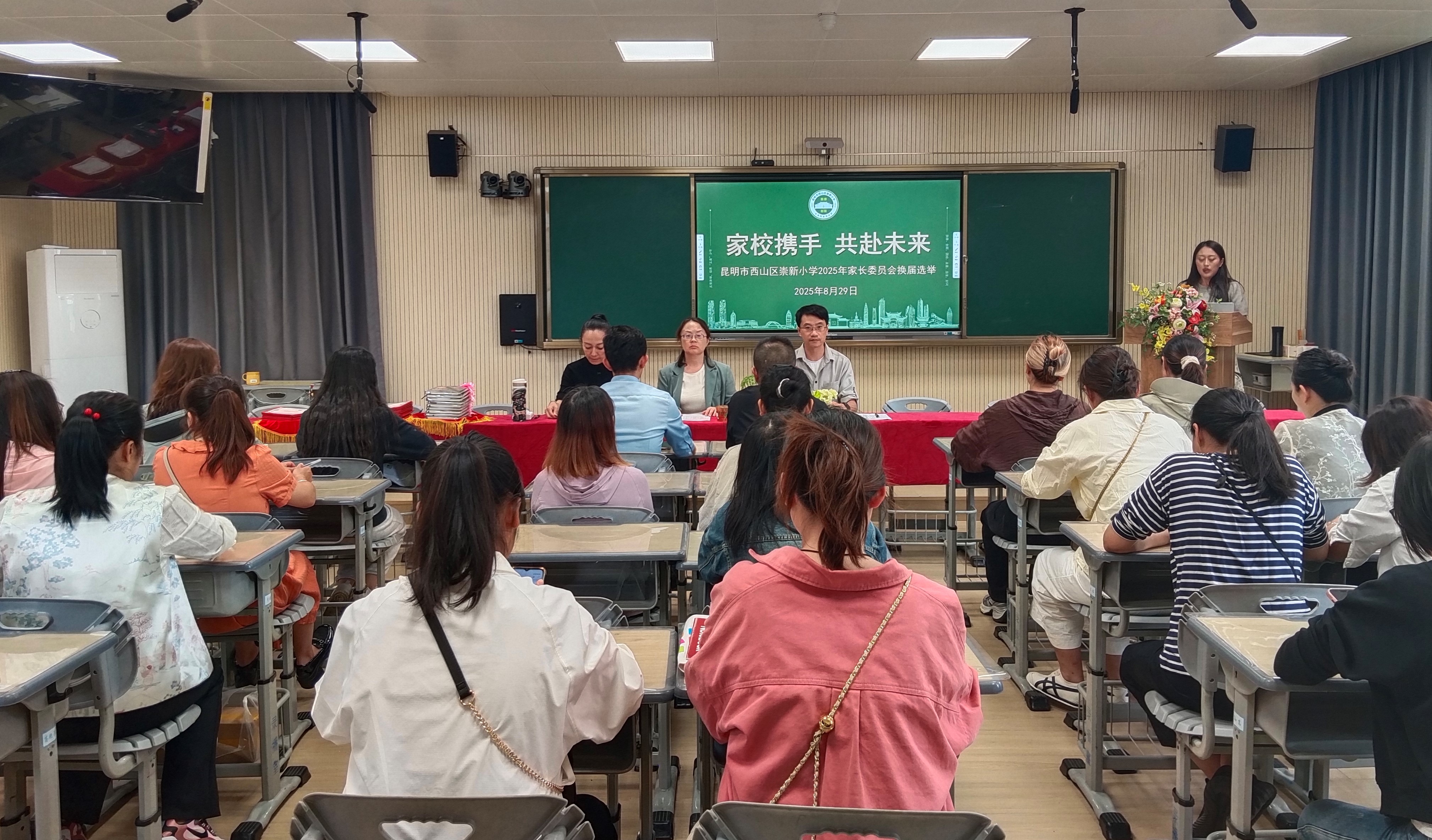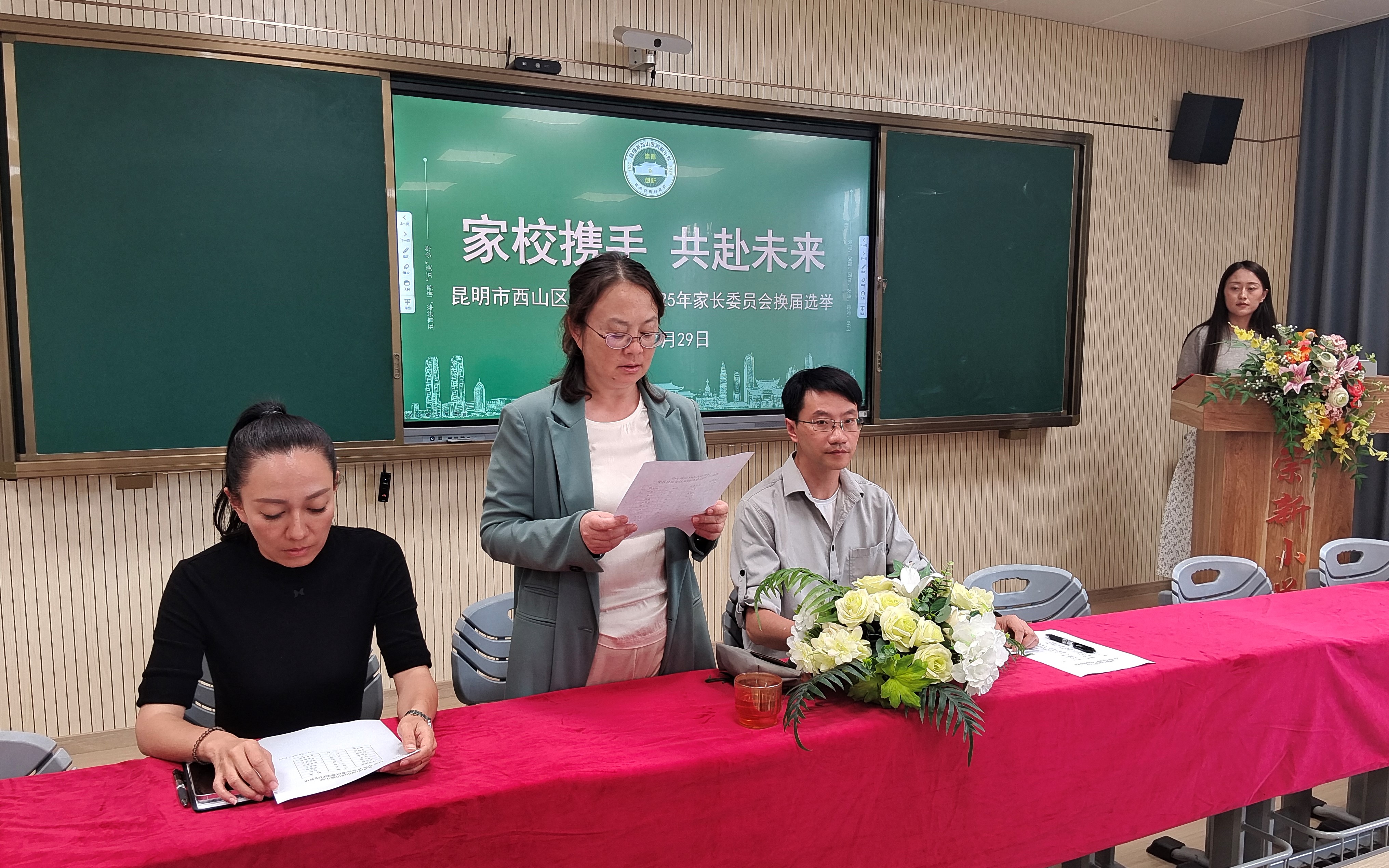 本次换届选举严格遵循公平、公正、公开的原则,流程清晰有序,10名候选人依次上台自我介绍,由校党支部书记、校长盛洪琳、党支部副书记郑力玮向各位候选人颁发聘书后,从中选举产生新一届校级家长委员会成员(会长1人,副会长2人,常务委员4人)共7人,选举结果得到家长们的一致认可,副校长石昕霭、郑力玮向当选的校级家委颁发校级家委聘书。最后,新当选的崇新小学家长委员会会长发表讲话,大队辅导员宣读《昆明市西山区崇新小学家长委员会章程(试行)》,经家委交流讨论,审议通过。