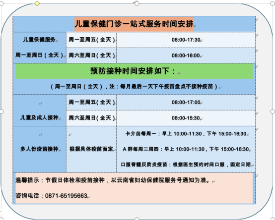 温馨提醒:出诊医生、具体号源等信息,建议提前在“云南省妇幼保健院服务号”查询,避免跑空;若有疑问,可随时咨询现场医护人员,或拨打儿保科咨询电话0871-65195663。