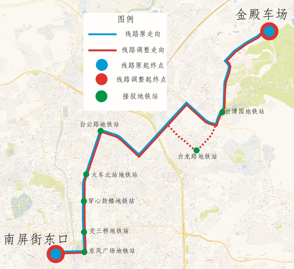 71路起终站为“金殿车场(始发站)—南屏街东口(终到站)”,为提升龙轩街、龙庆路、白龙路沿线市民在地铁4号线白龙路地铁站的公交、地铁换乘需求,对71路的线路走向和停靠站点进行局部优化调整。71路调整后,保留接驳地铁2号线白云路、穿心鼓楼、交三桥地铁站,地铁5号线世博园地铁站,地铁2/4/5号线火车北站地铁站,地铁2/3号线东风广场地铁站的功能,整体提升71路的线路区域化服务功能。