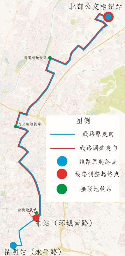 25路原起终站为“北部公交枢纽站(始发站)—昆明站(永平路)”,为提升25路营运车辆周转率,缩短乘客候车时间,将25路起终站调整为“北部公交枢纽站(始发站)—东站(环城南路)”。25路调整后营运时间、票制票价不变,保留接驳地铁2号线北部汽车站、霖雨桥地铁站,新增接驳地铁6号线岔街地铁站的接驳功能,整体提升25路的线路区域化服务功能。