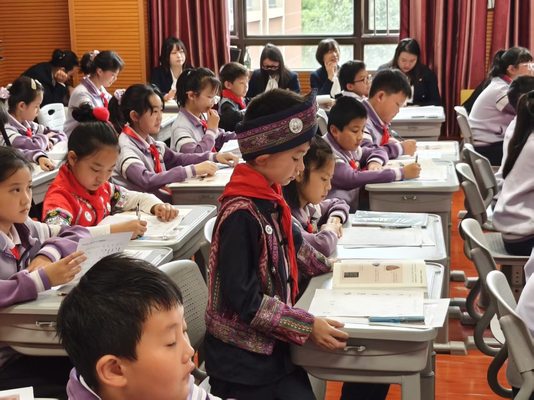 课堂上,吕瑜通过人民币实物引导学生解码藏文、维吾尔文等“团结密码”,借助十二生肖甲骨文连线,将文字学习转化为文化探秘,依托AI数字人讲解汉字书法艺术,并播放各民族语言同唱《歌唱祖国》视频。一系列设计让学生在对比、互动中直观感受民族文字的独特魅力,深刻理解“多元一体”的中华文化内涵。