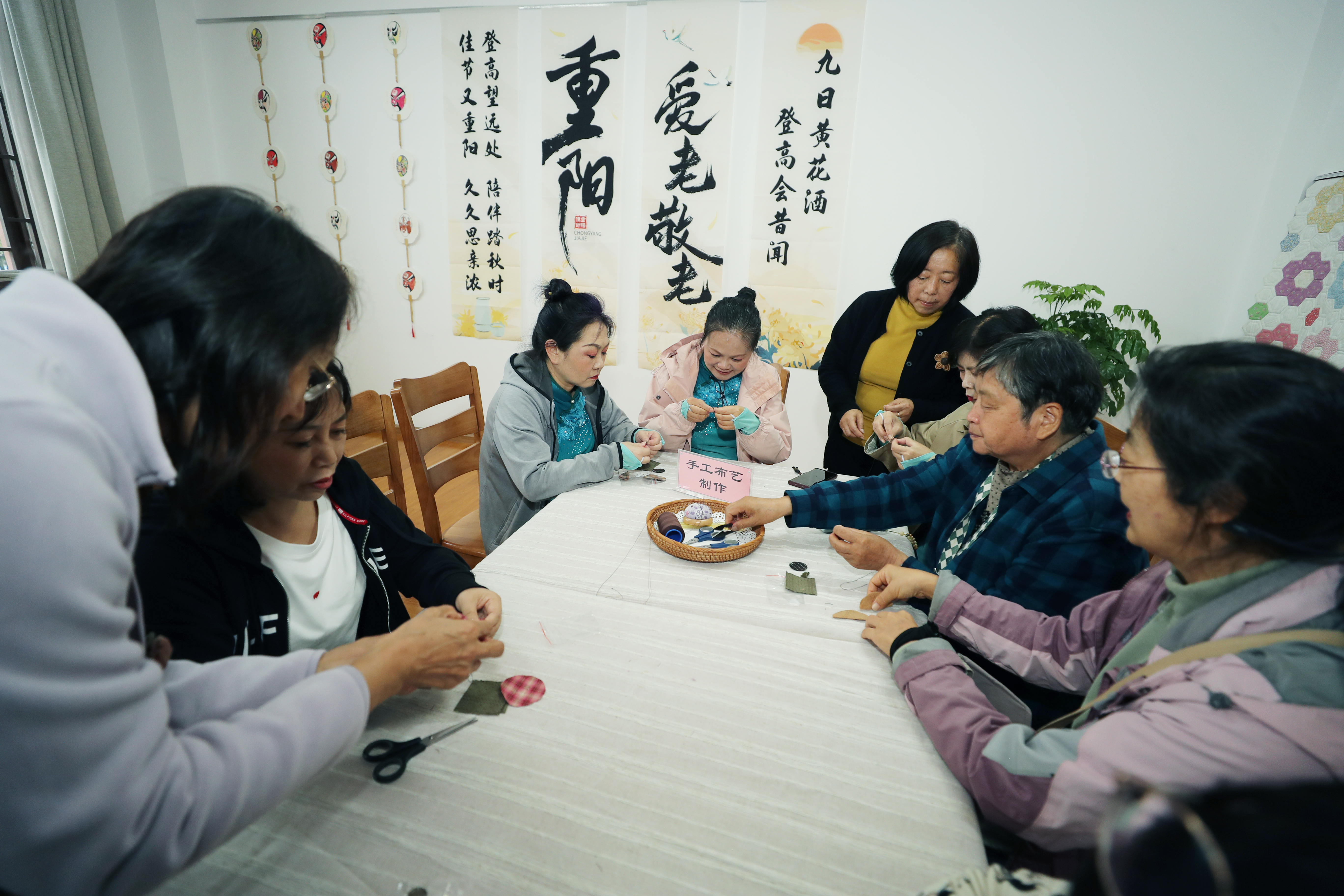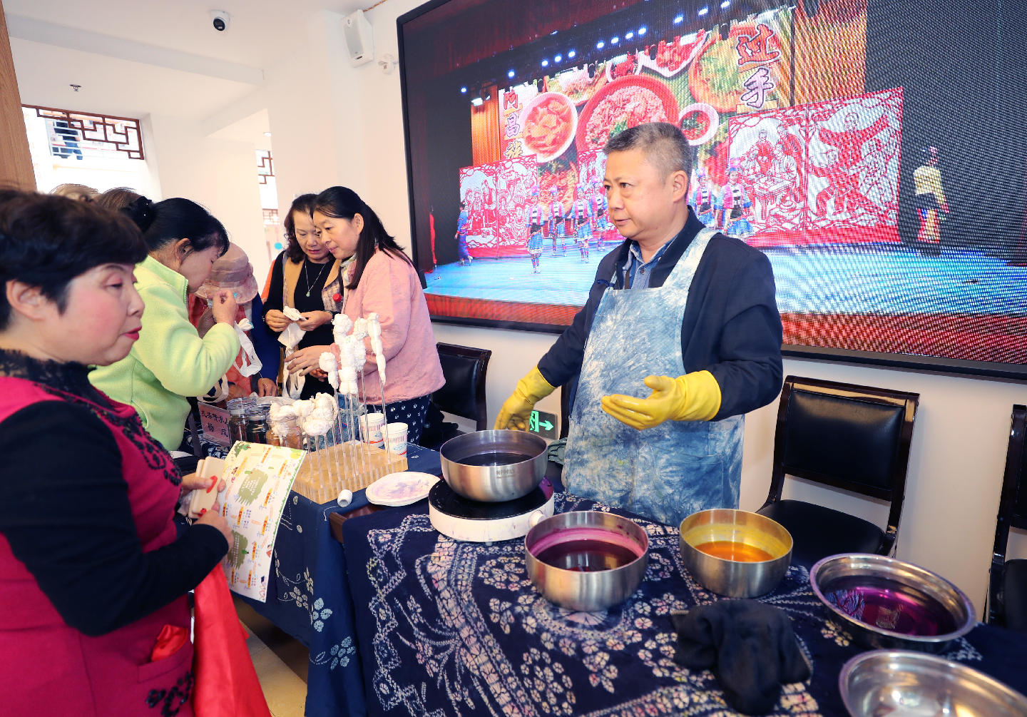 学员们沉浸其中,或专注创作,或笑语盈盈,现场化作一片欢乐的海洋。一位银发学员兴奋地将自己亲手扎染的蓝底白花布举过头顶,朝着镜头比出“耶”的手势,开心地说:“看,我把天空染成了18岁!”