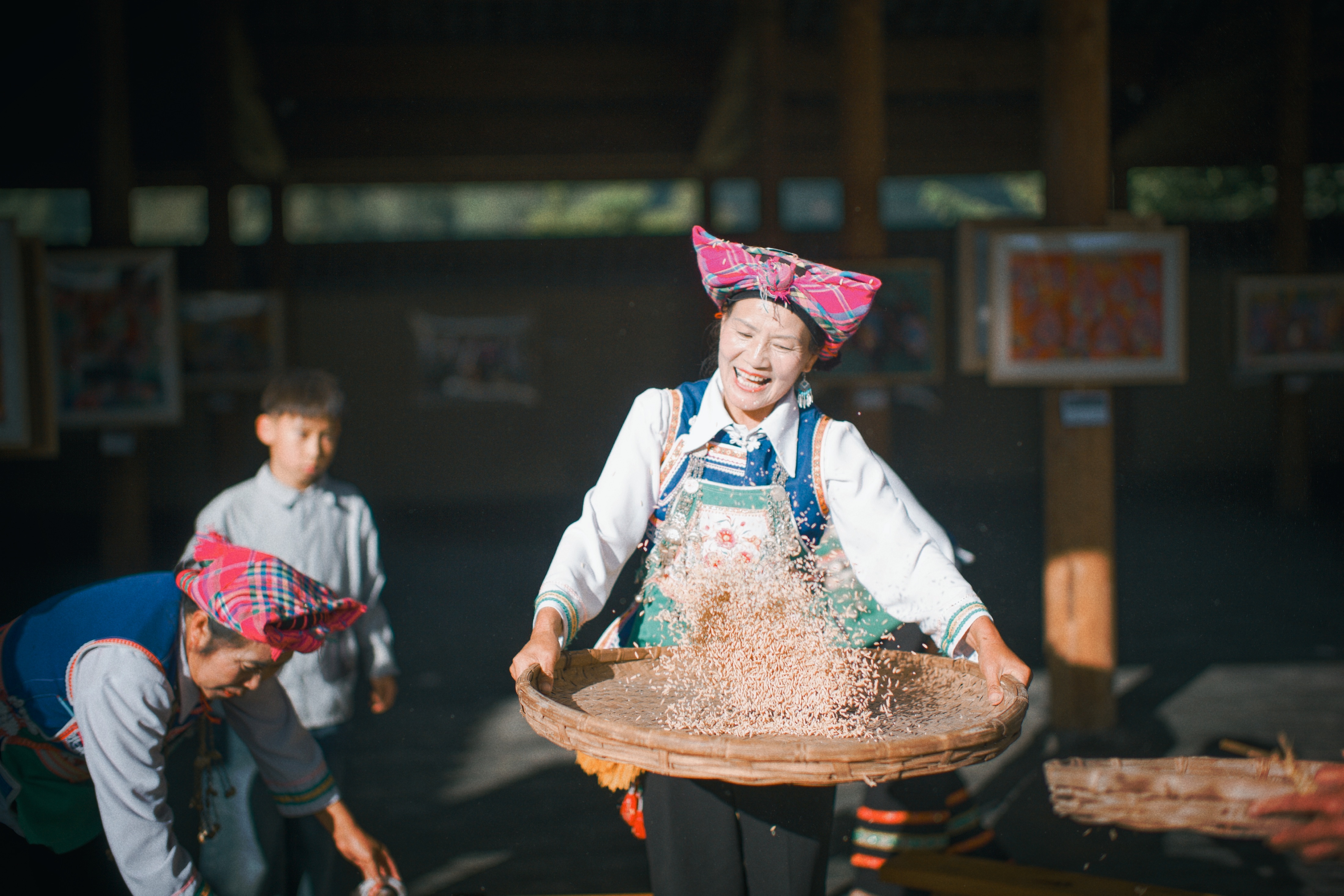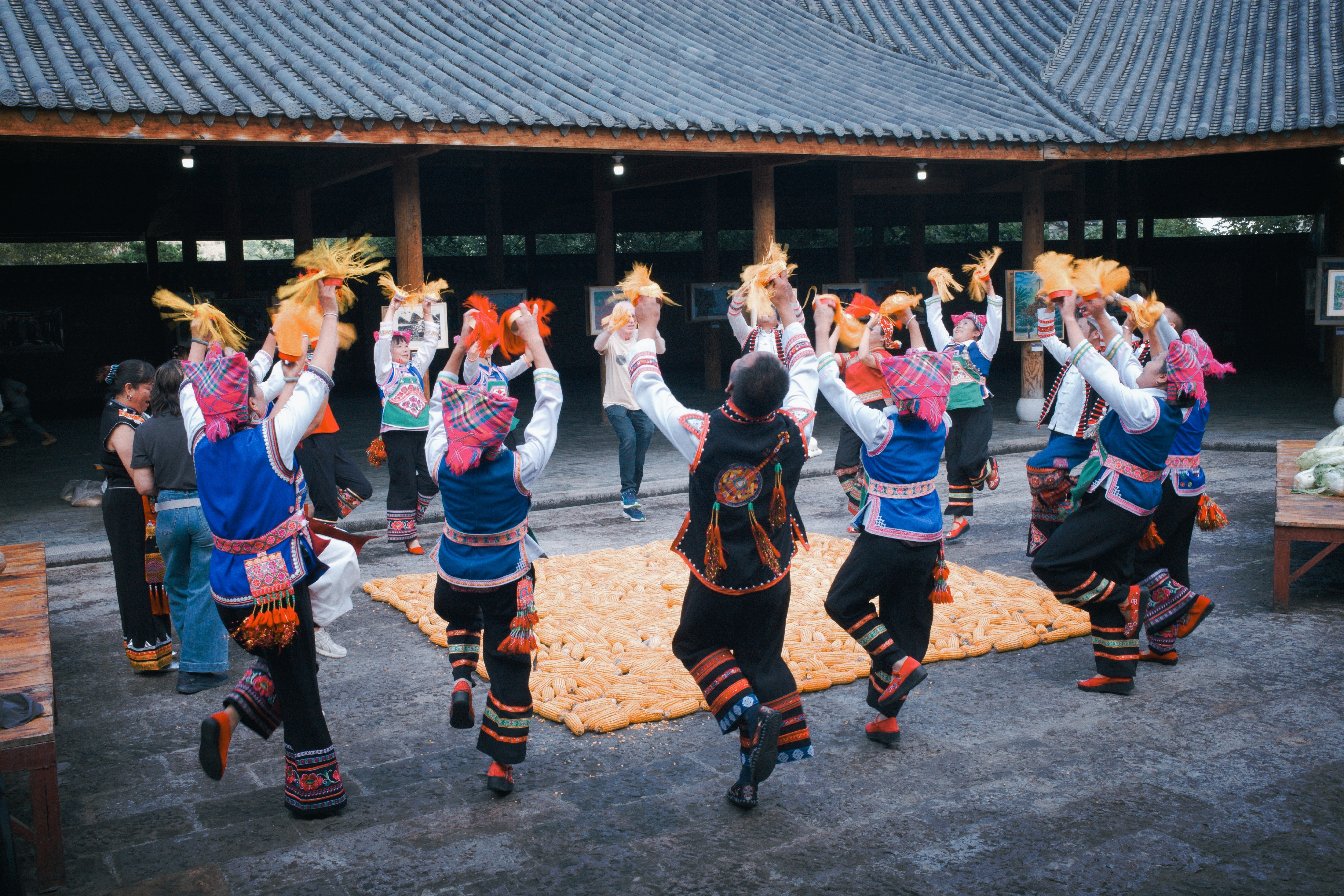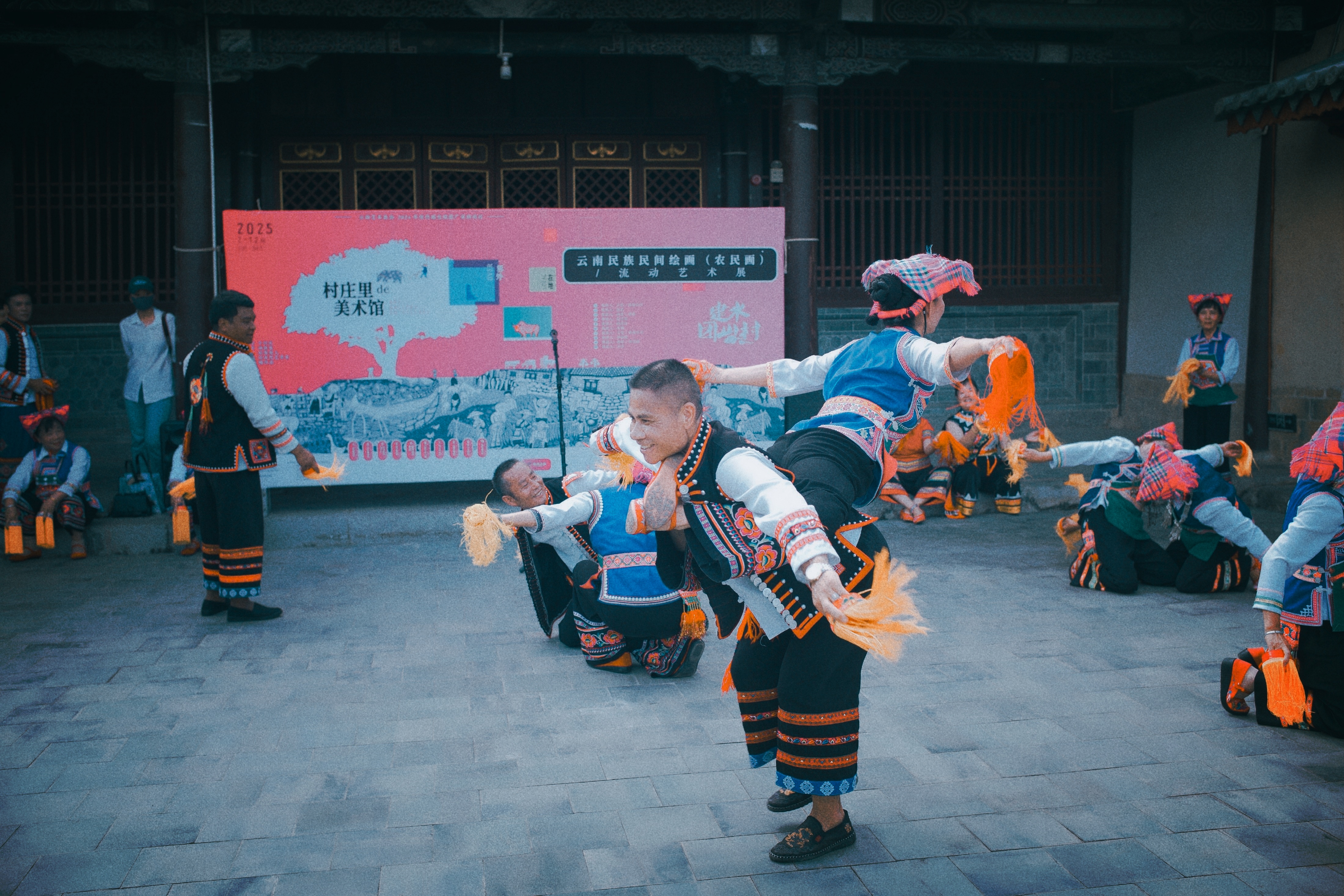 18日下午,秋阳隐现,嘉宾与观众陆续入场,跟随展览走进至今600余年的建水县团山村,在滇南传统民居的窗棂与青瓦间,倾听乡土与艺术的故事。开幕式现场,热烈的烟盒舞拉开序幕,建水草编艺人和烟盒彩绘师现场展示传统技艺,手的温度、草的清香、颜料的色泽交织在一起,让人真切感受到来自土地的创造力。