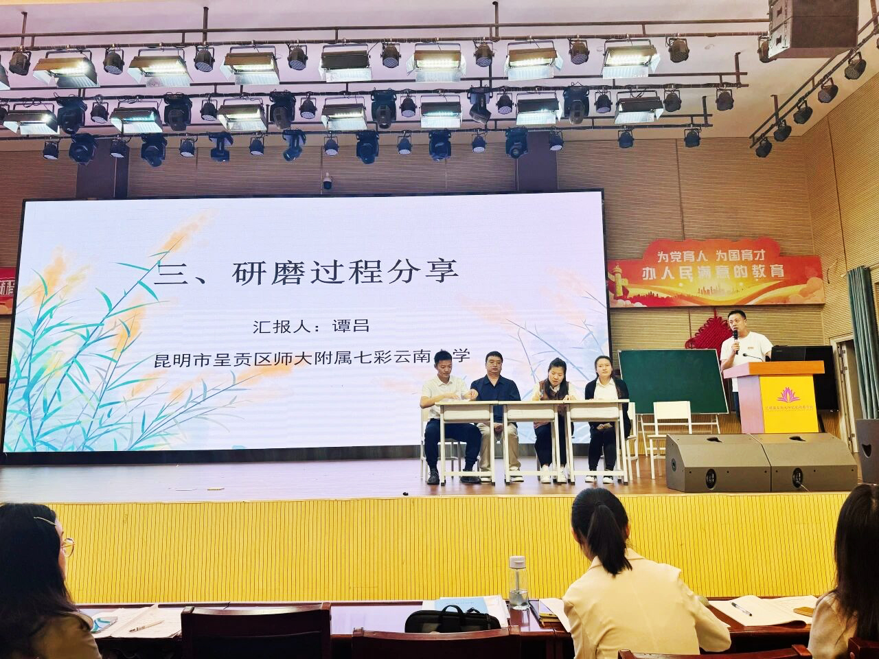 教师谭吕接着分享。他生动讲述了“七彩团队”的教研协作故事。 他回忆道,为打磨一个教学细节,团队成员常常讨论到深夜;为选择一个最贴近学生的案例,大家会搜集比对数十个生活实例。这次赛课,不仅展示了教师个人能力,更体现了“七彩团队”的合力。