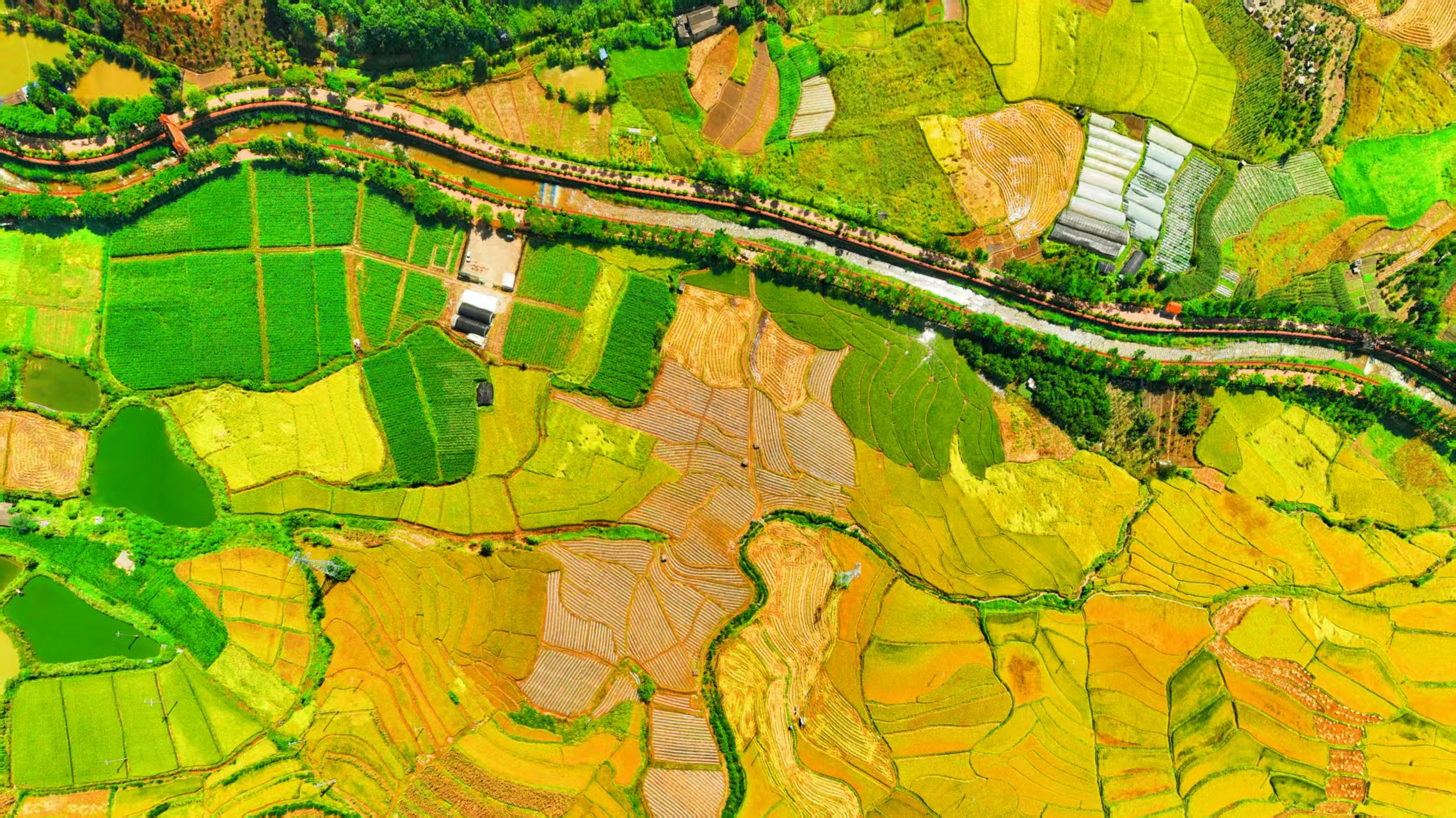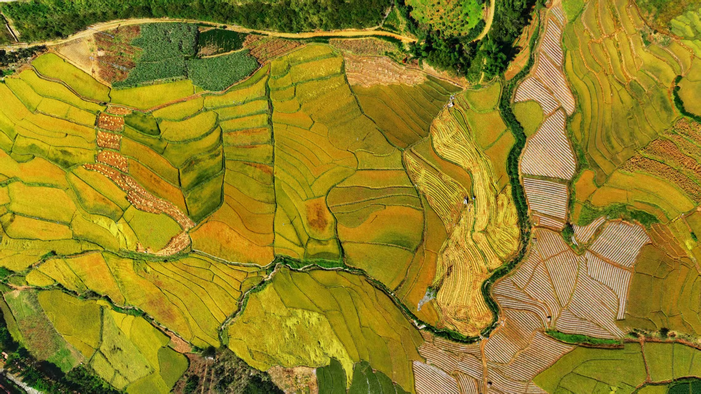 走进芒东寨子稻田,目之所及皆是金黄。连片的水稻田顺着地形铺展,饱满的稻穗在阳光下泛着温润的光泽,仿佛给大地披上了一层金色的地毯。微风轻轻拂过田间,稻穗随风摇曳,发出“沙沙”的声响,那是丰收的序曲在耳畔奏响。