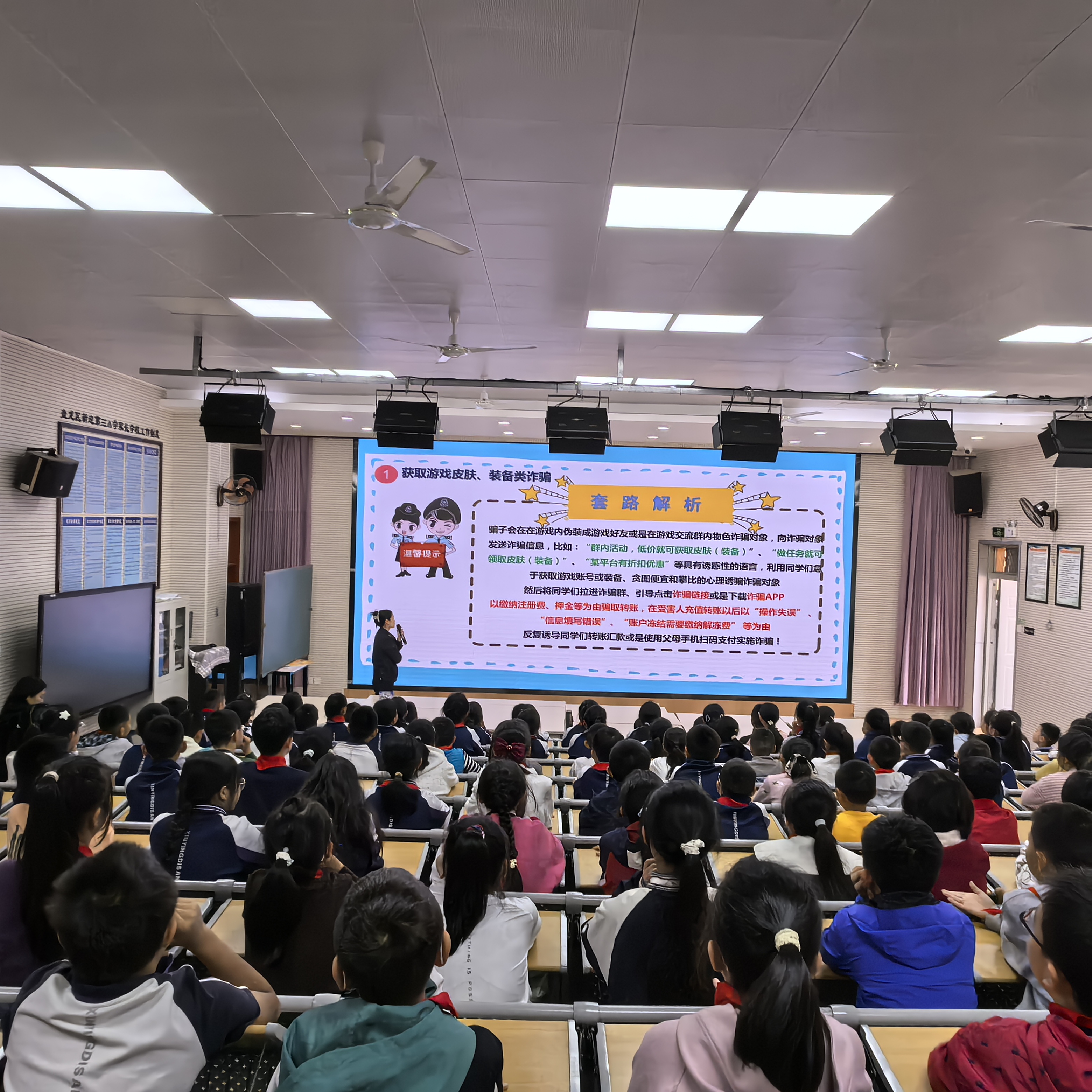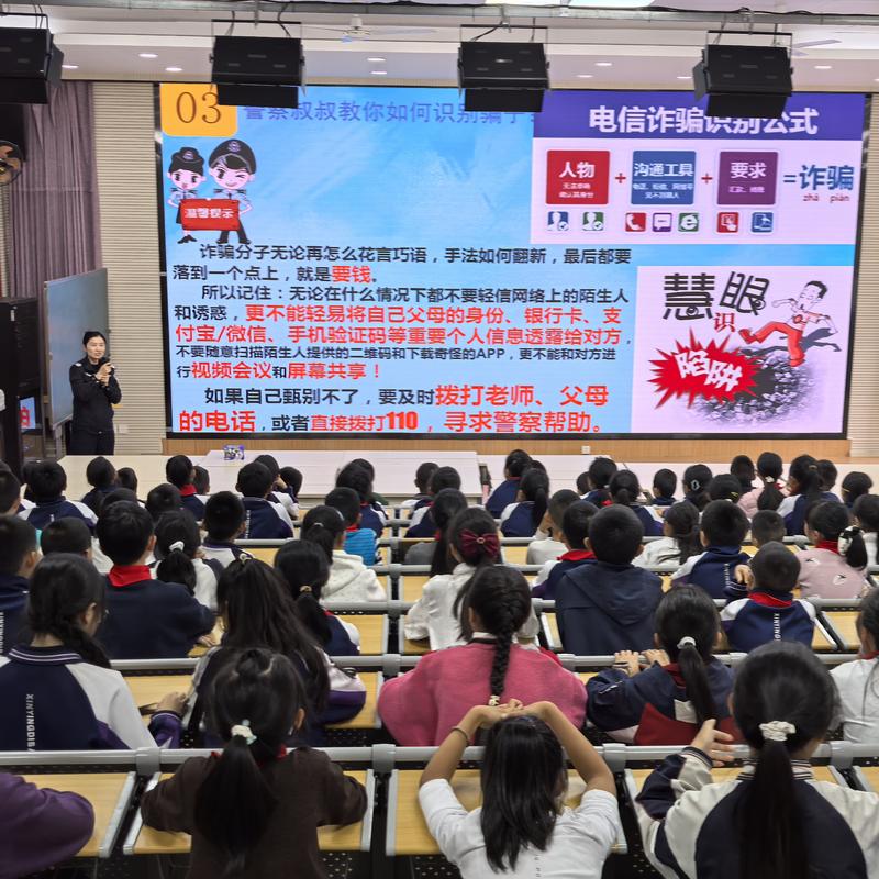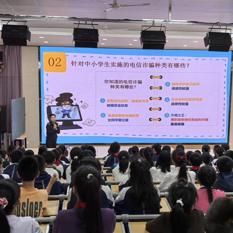 讲座中,民警结合小学生的认知特点,通过生动的PPT演示,从“什么是电信网络诈骗”“针对中小学生的诈骗种类”“如何识别和防范诈骗”三个方面进行了详细讲解。