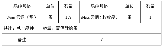 2025年10月22日,我局执法人员在呈贡区七甸街道中通快运昆明分拨中心查获卷烟:84mm云烟(紫)139条、84mm云烟(软珍品)1条,共计贰个品种壹佰肆拾条,并依法予以先行登记保存。