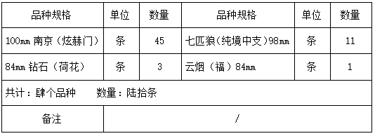 2025年10月21日,我局执法人员在昆明市呈贡区乌龙街道朝云街与彩云南路交叉口七彩云南第壹城路边查获卷烟:100mm南京(炫赫门)45条、84mm钻石(荷花)3条、92mm七匹狼(纯境中支)11条、84mm云烟(福)1条,共计肆个品种陆拾条,并依法予以先行登记保存。