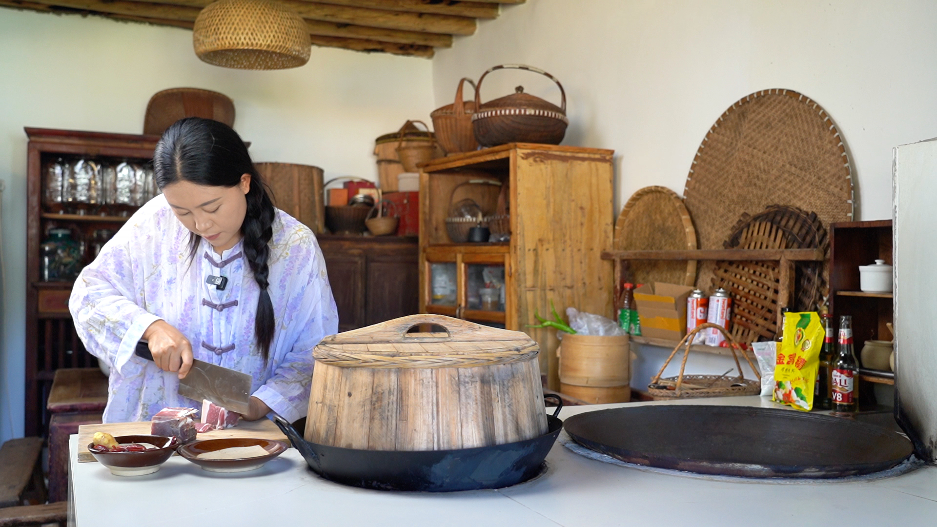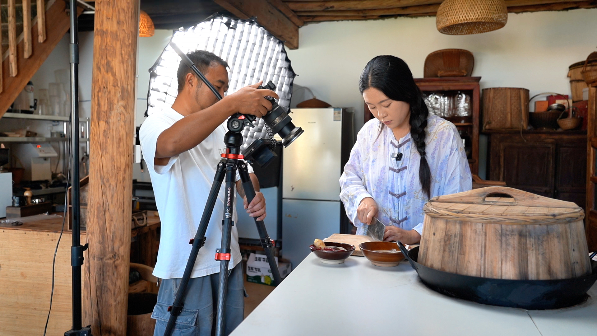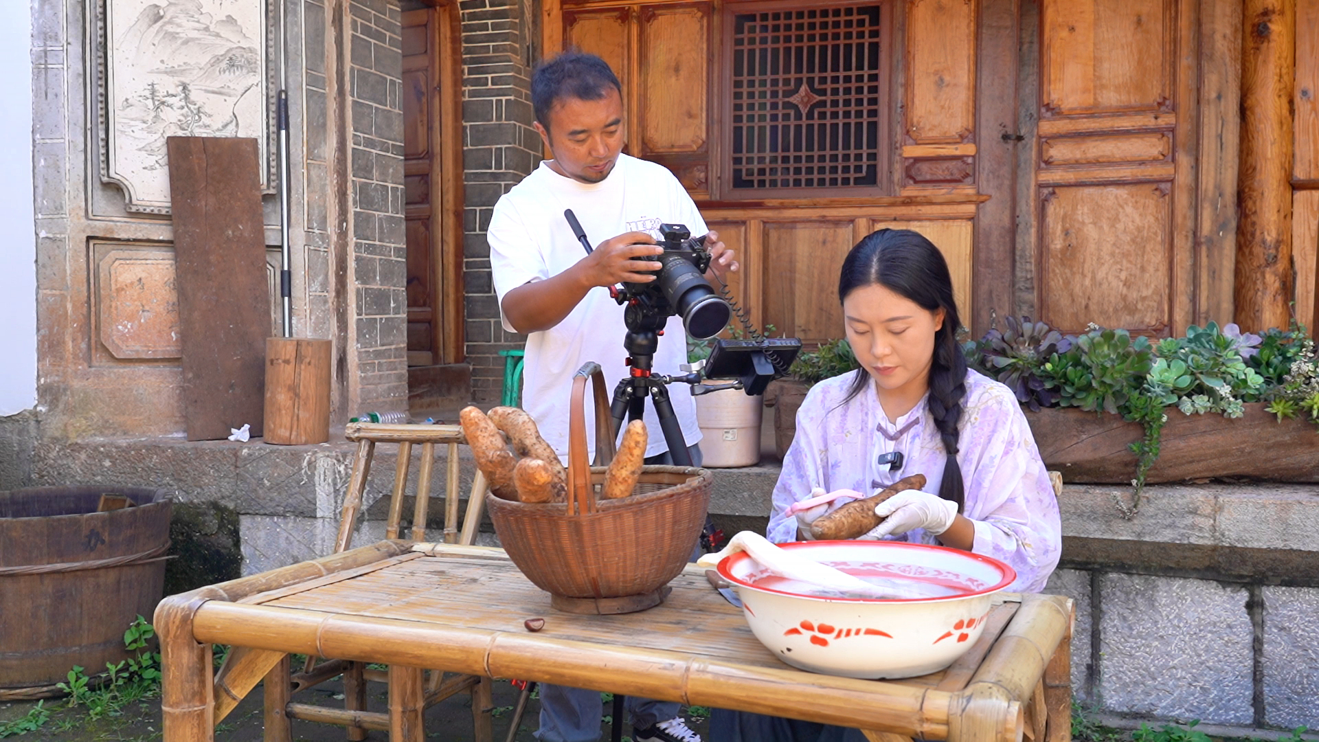 张蕊与丈夫从事云南本地美食相关的短视频拍摄创作和自媒体运营,以前在县城自家场地内拍摄,但由于发展的原因,原来的场地已经不能满足拍摄创作的需求,两夫妻萌生了在鸡足山租院子改造的想法,于是在山脚下的南村租了一个老院子。张蕊介绍说:“我们做短视频的初衷,就是振兴乡村经济,把我们家乡的土特产、文化带给全国各地的朋友。我们最后选择了鸡足山这块场地,首先是觉得环境、空气都非常非常好,一眼就看上了,哇,这个地方真的太喜欢了!”