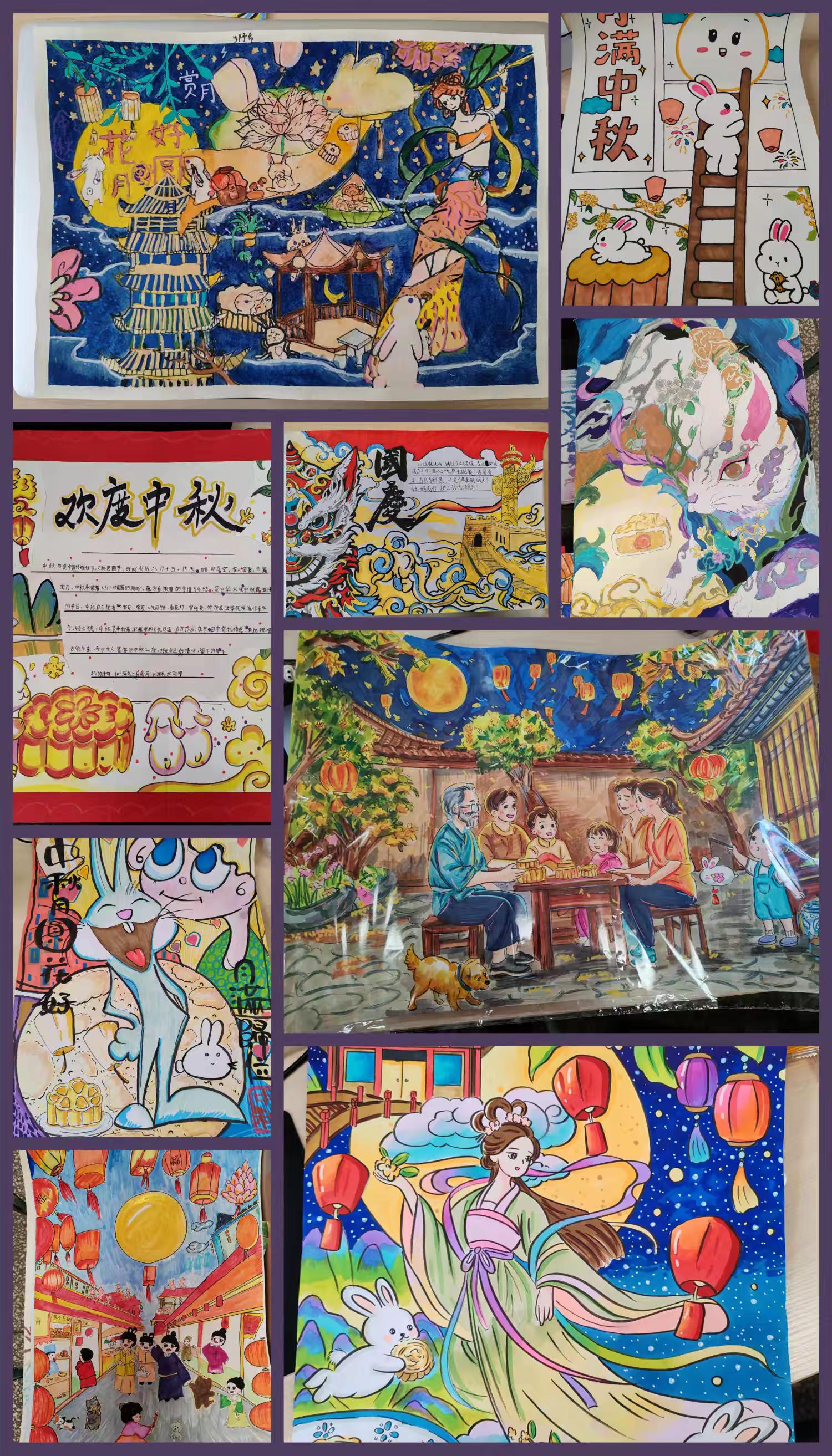 其中,还围绕中秋文化主题,学校德育处策划了两大特色创作活动,为学生提供展现才华的平台。在“中秋印象”主题绘画创作中,学生用笔触绘制出充满童趣的赏月图,各班共推荐44幅优秀作品,生动展现了学生对“团圆、感恩”等中秋文化精神的理解与诠释。与此同时“变废为宝・中秋创艺”手工制作活动同步开展。同学们充分发挥想象力与动手能力,将废旧红包、包装盒、布料等闲置材料“变废为宝”,精心制作出剪纸、灯笼、布艺等各类手工作品80余件。这些作品既融入了中秋传统元素,又践行了绿色环保理念,在传承传统工艺的同时,也让学生深刻体会到 “匠心精神” 与 “环保责任” 的双重意义。