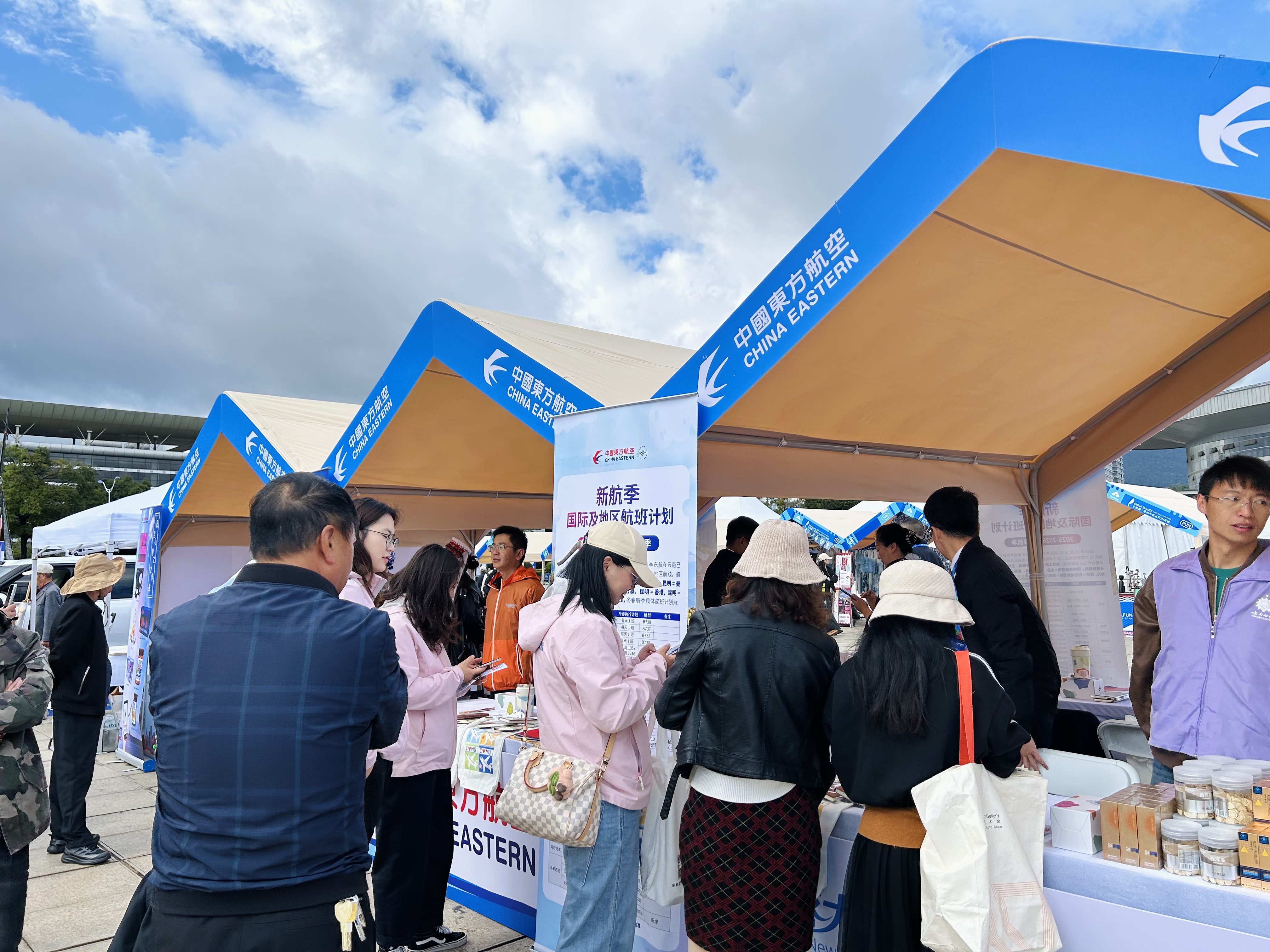 赛事期间,东航的航空元素也深度融入活动场景。在大理国际奥林匹克体育中心的“千帆市集”区域,东航打造以“能量驿站”与“云端体验”为主题的专属展区,为赛事参与者提供一站式航空出行咨询服务。东航特色文创产品也备受青睐,MuMuJi玩偶、国产大飞机C919模型等周边吸引众多观众驻足,掀起现场打卡热潮。此外,东航客舱乘务员也以赛事礼仪志愿者身份亮相大会开闭幕式等重要环节,承担颁奖互动与嘉宾引导工作,以“精心、精准、精致、精细”的服务展现东航品牌风采。