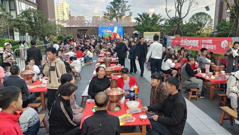 凉米线油亮爽滑,油焖大虾色泽诱人,铜炊锅里的高汤“咕嘟”作响,冒着腾腾热气——10月25日下午5点半,玉溪市红塔区邦泰·天誉小区中心广场,一排排四方木桌整齐排列,68张桌子上摆满各色美食,住户们围坐在一起,品尝佳肴,闲话家常,脸上洋溢着幸福的微笑。这是邦泰第八届“邦里节”的活动现场。