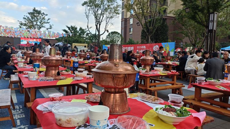 暮色渐深,炊锅依旧咕嘟作响,孩子们的欢笑声在广场上空回荡。68张餐桌旁,新邻旧友的交谈声愈发融洽,仿佛是一场久别重逢的家宴。