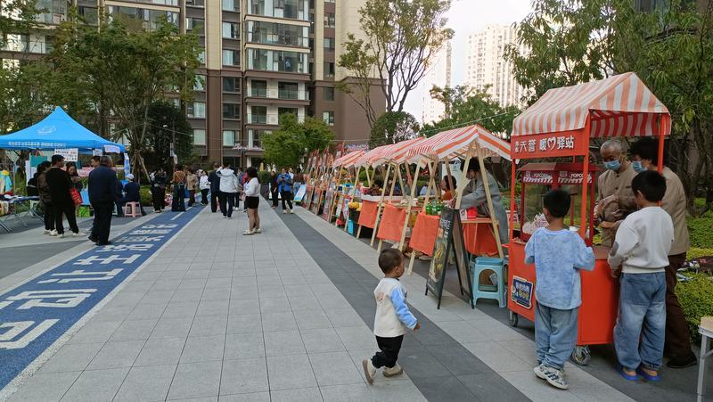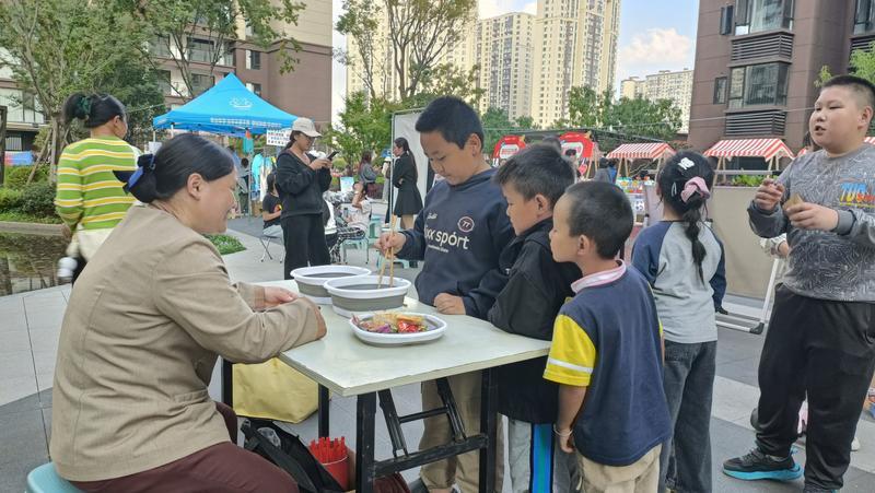 广场一侧,“泰好玩市集”的20个摊位上,卤菜、炸鸡、爆米花等美食飘香;游乐区内,夹乒乓球等小游戏吸引了不少孩子排队参与。住户们扶老携幼参加活动,小区里满是孩子们的欢笑声。