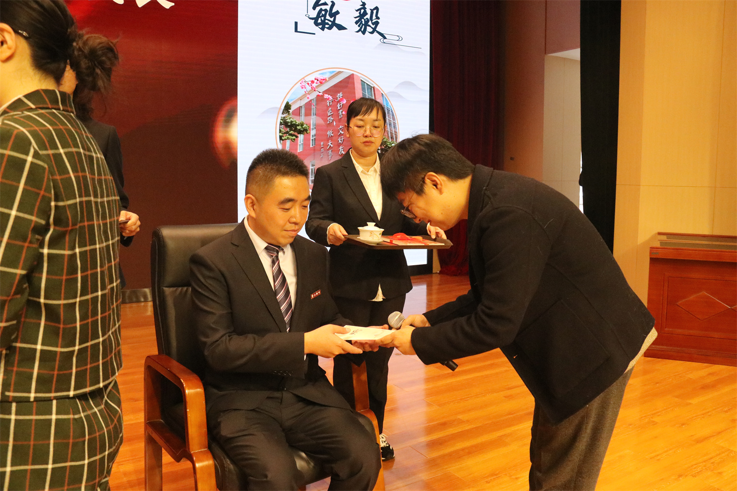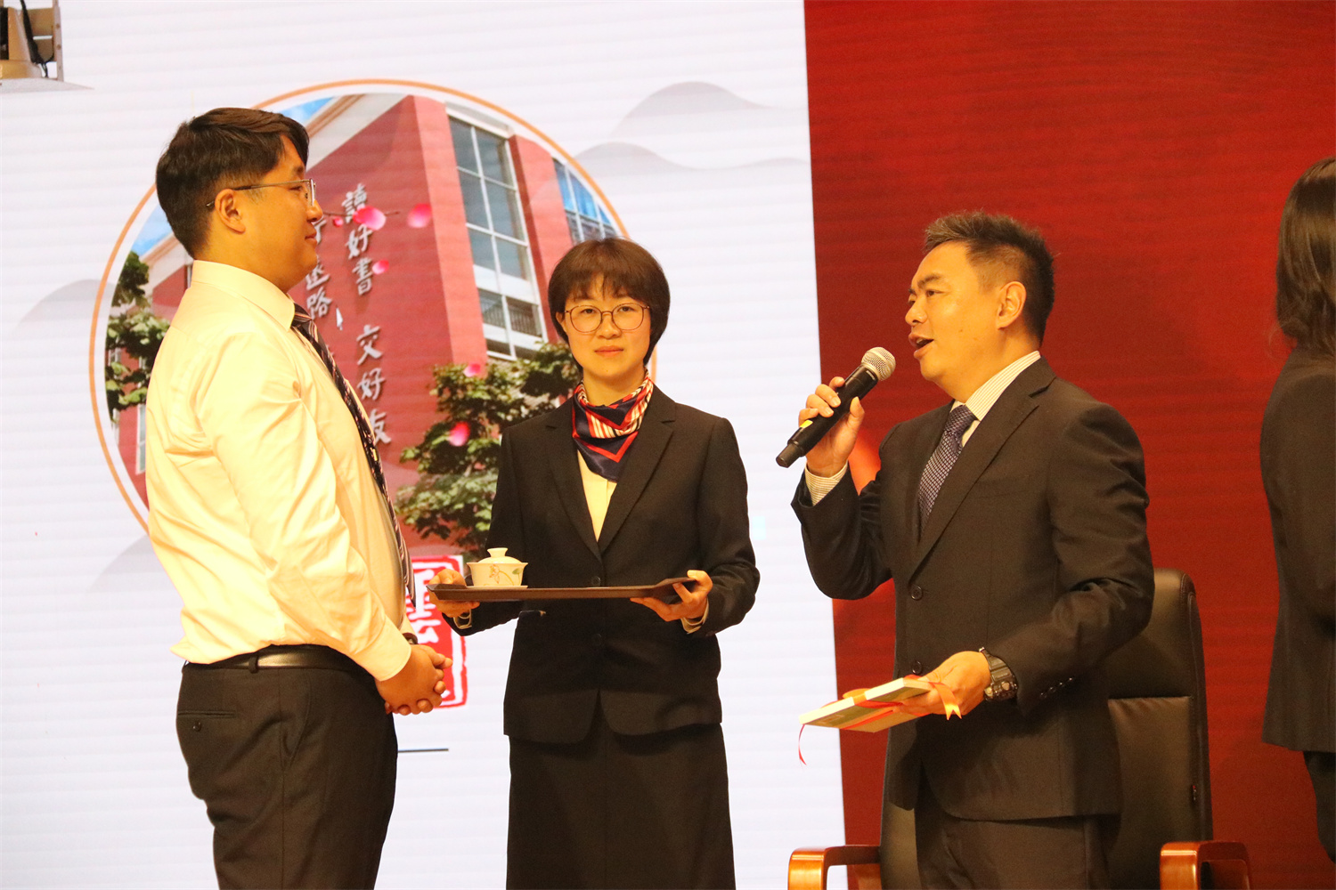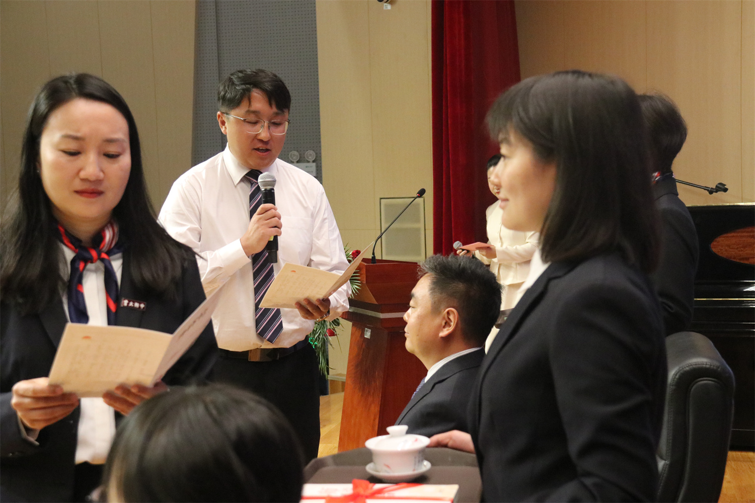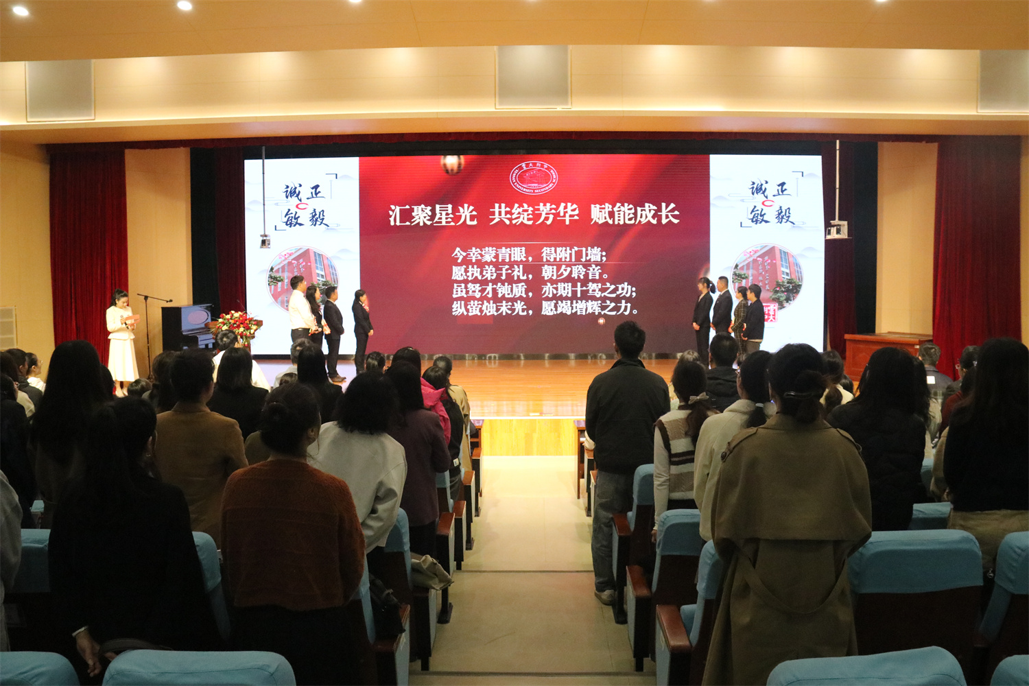 一纸拜师帖,承诺千钧重;一盏清茶,饱含尊师情。名师们向弟子赠书并赠言,字字珠玑,一片冰心。随后,全场所有工作室成员及学员共同起立,齐声诵读拜师誓言:“虽驽才钝质,亦期十驾之功;纵萤烛末光,愿竭增辉之力。”铿锵之声响彻会场,展现了新一代教育人追光而行、矢志传承的决心与担当。