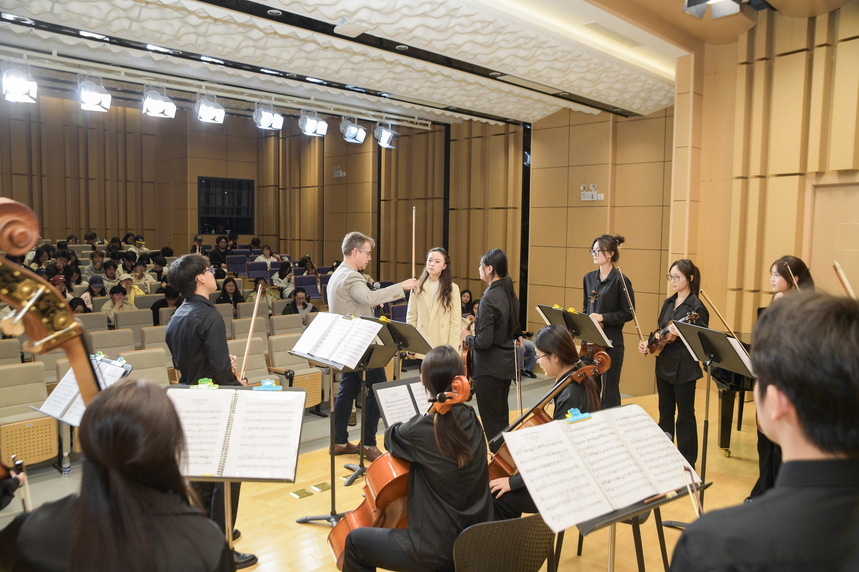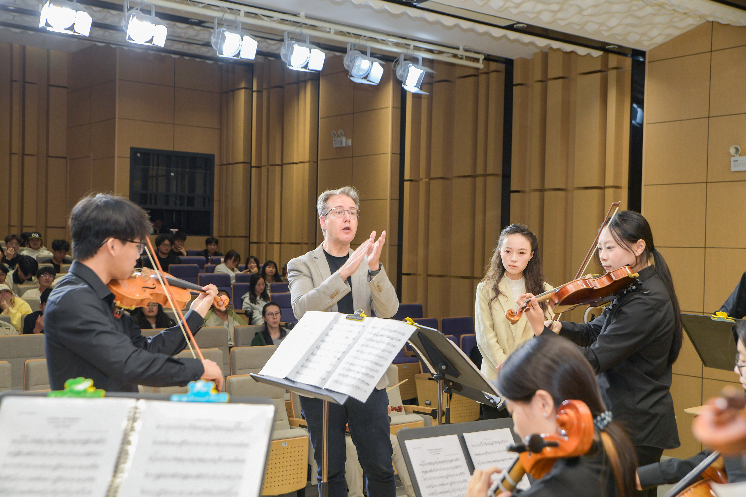 此外,卢克·多尔曼教授还为艺术学院学生亲授了一堂生动的大师课。他结合自身丰富的指挥与演奏经验,针对学生在器乐演奏中存在的姿势、运弓、音色控制等基础问题逐一示范,细致讲解。他特别强调演奏中“听”与“感”的结合,引导学生通过调整身体与乐器的互动关系,实现更自然、通透的音色表达。学生们在大师课上积极互动,纷纷表示此次学习不仅提升了演奏技巧,更深化了对音乐表现的理解。