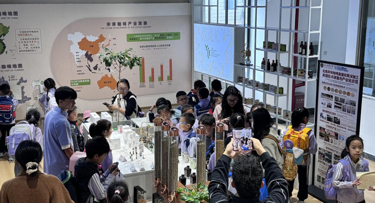 在咖啡现代产业学院,星火馆志愿者与学院专业教师系统讲解了咖啡的起源、传播路径以及云南咖啡的品种特色与产业优势,将专业知识点融入生动的讲解之中。在咖啡加工工艺流程图展区,同学们驻足记录,当了解到一杯成品咖啡需历经二十余道加工工序时,现场响起阵阵赞叹,深切体会到农产品加工的严谨性。