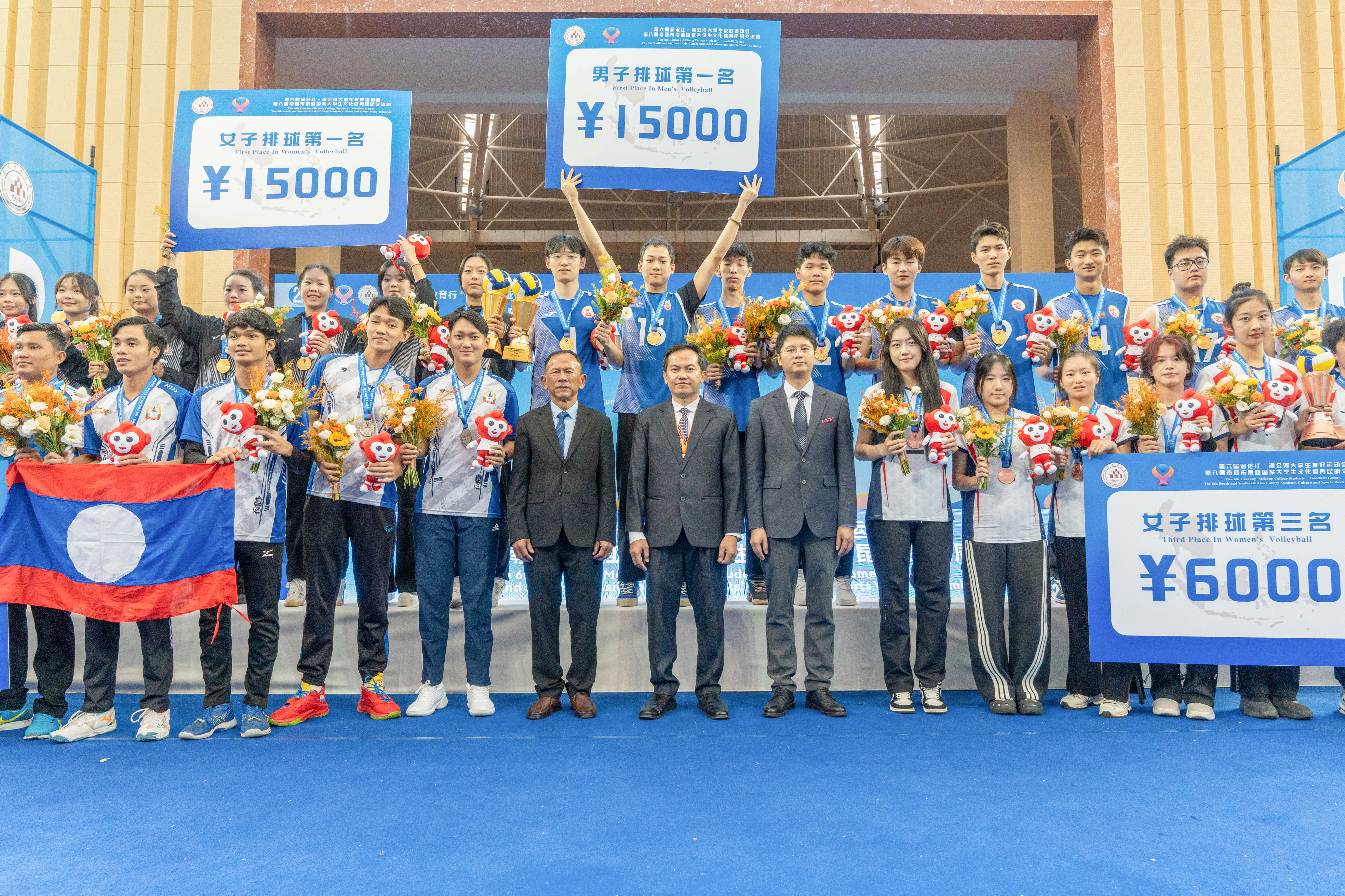 与会嘉宾共同为羽毛球、排球、足球、武术四个大项的获奖运动员颁奖。