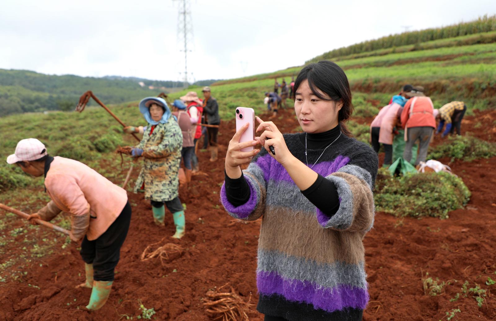 在水库的坝体上,95后尹正会正接着外地客户的电话,熟练地回答着关于党参的问题。她是冬瓜林村的人,也曾是昆明的一名打工者,但近两年,老家党参产业的红火吸引她归来。如今,她在抖音上拥有7.5万粉丝,是一名自媒体从业者。