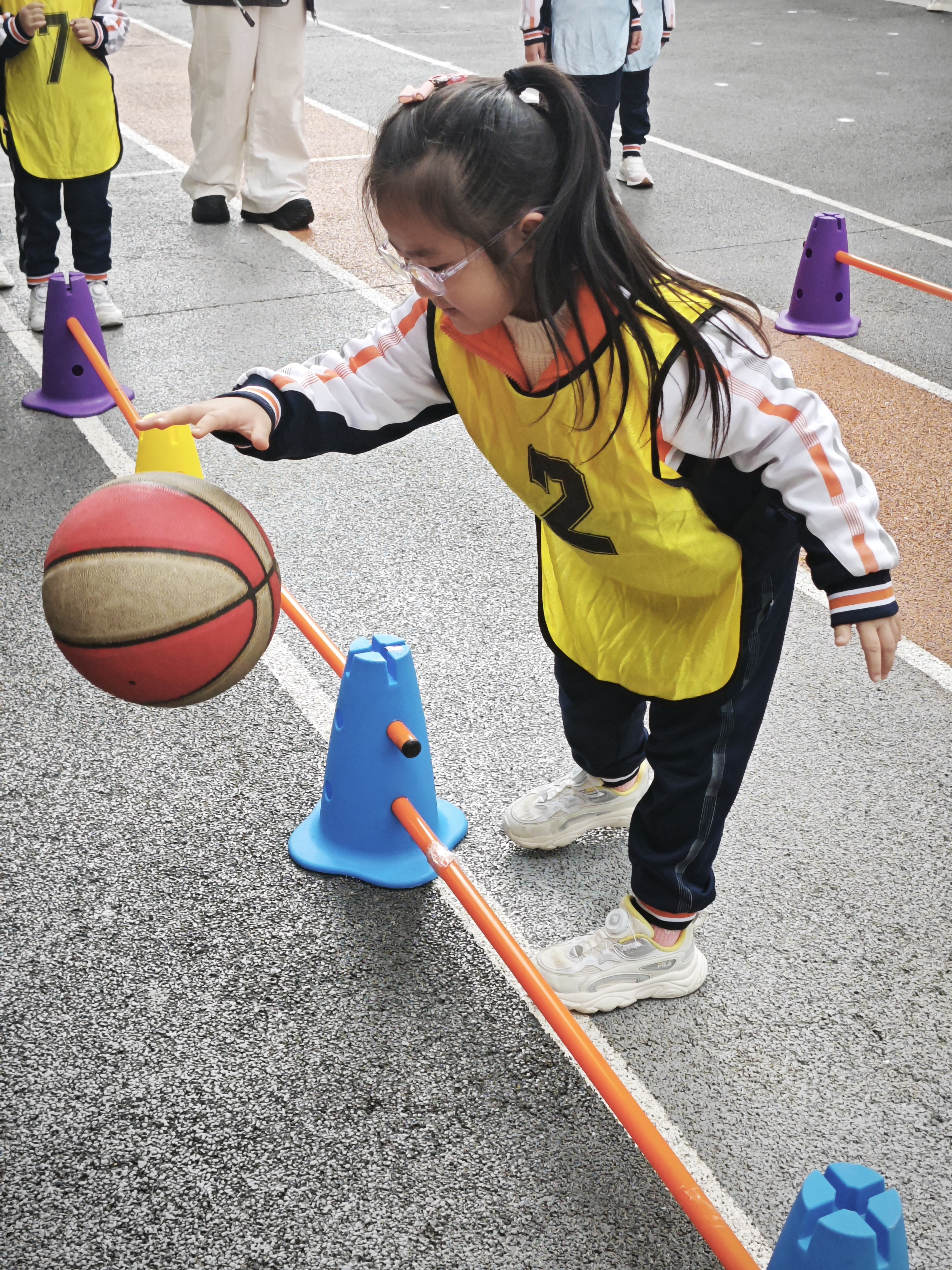 随后的集体赛将活动氛围推向高潮。S型拍球接力赛上,各班队伍弯腰穿梭、左右摇摆,接力棒交接的瞬间凝聚着集体荣誉感;过竿拍球环节,面对高低不一的障碍竿,孩子们灵活跳跃、稳稳控球,加油声与拍球节奏完美共振,展现出超强的协作能力。