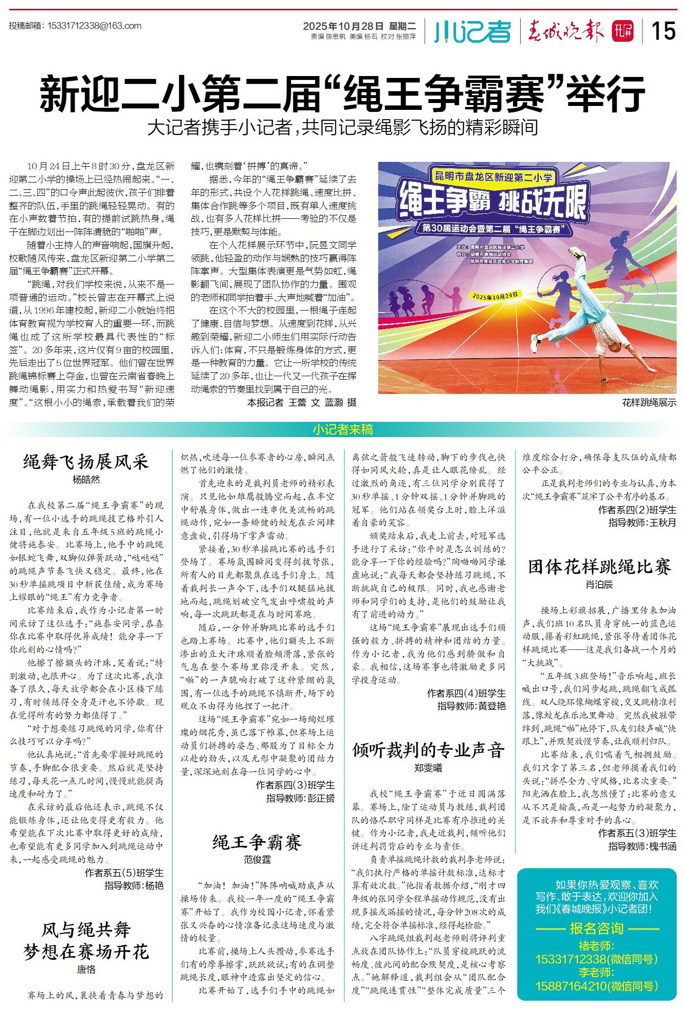 10月24日上午,盘龙区新迎第二小学的操场上,“一、二、三、四”的口令声此起彼伏,跳绳在空中划出一道道轻盈的弧线。第二届“绳王争霸赛”如约开幕,比赛现场,春城晚报大记者携手小记者,共同记录绳影飞扬的瞬间——镜头里有专注的眼神、飞扬的身影,也有团结与拼搏的力量。通过他们的笔触,我们看见的不仅是比赛的速度与技巧,更是孩子们在运动中迸发的自信与成长。