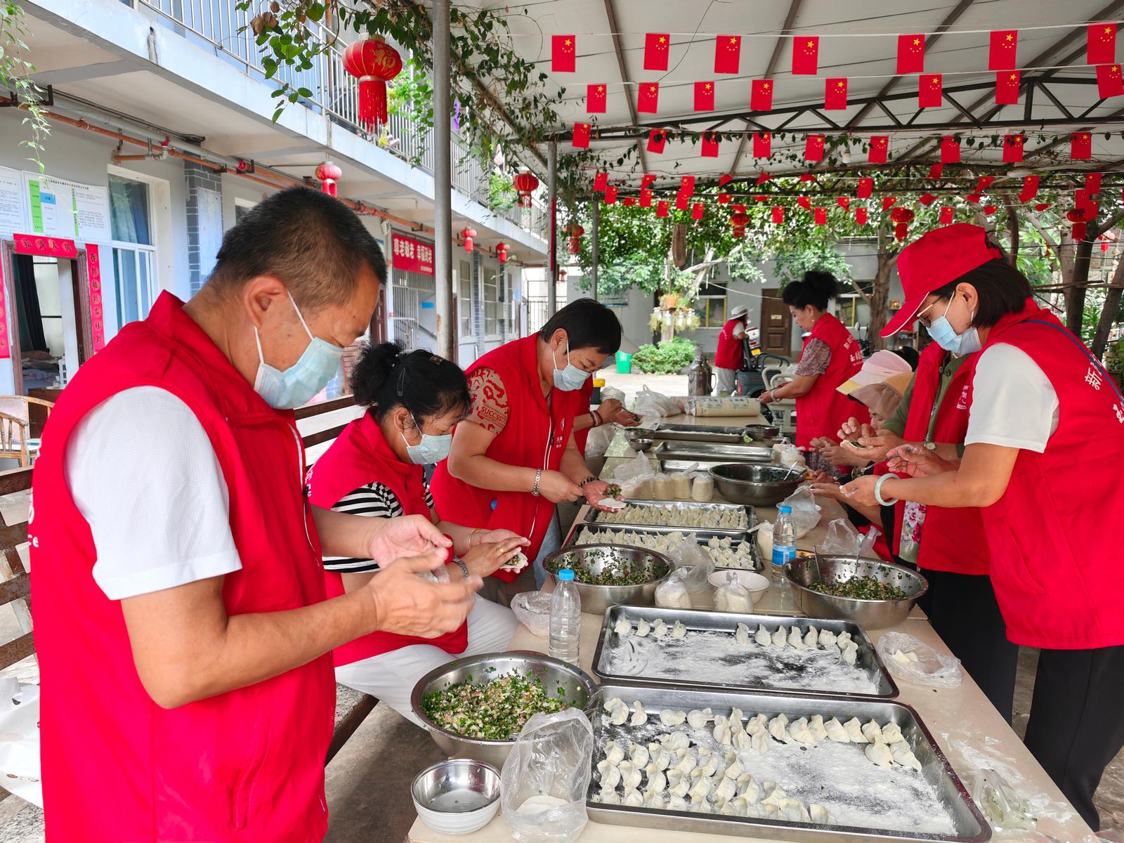 除了歌舞表演,旅居元江志愿服务队的志愿者们迅速行动起来,挽起袖子开始包饺子。大家分工明确、配合默契,有的负责擀皮,有的负责调馅,还有的负责包制。手法娴熟间,一个个形状饱满、胖乎乎的饺子便整整齐齐地摆满了托盘。