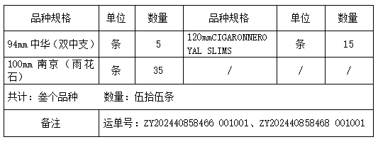 2025年10月28日,我局执法人员在昆明市呈贡区七甸街道中通快运昆明分拨中心查获卷烟:94mm中华(双中支)5条、100mm南京(雨花石)35条、120mmCIGARONNE ROYAL SLIMS15条,共计叁个品种伍拾伍条,并依法予以先行登记保存。