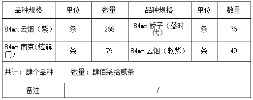 2025年10月28日,我局执法人员在昆明市呈贡区洛羊街道联运大道云南放新国际物流园内云南速邦物流有限公司查获卷烟:84mm云烟(紫)268条、84mm娇子(蓝时代)76条、84mm南京(炫赫门)79条、84mm云烟(软紫)49条,共计肆个品种肆佰柒拾贰条,并依法予以先行登记保存。