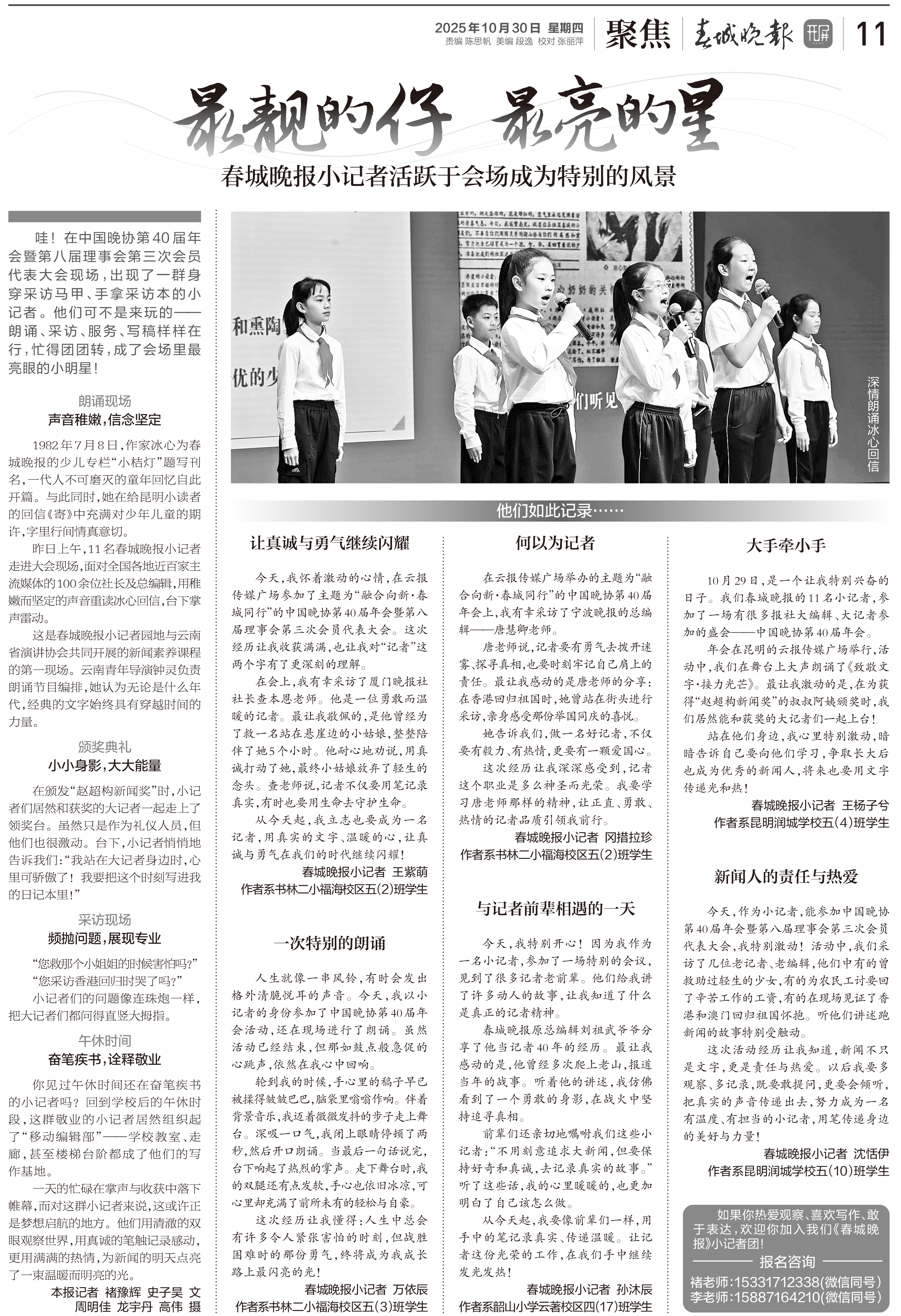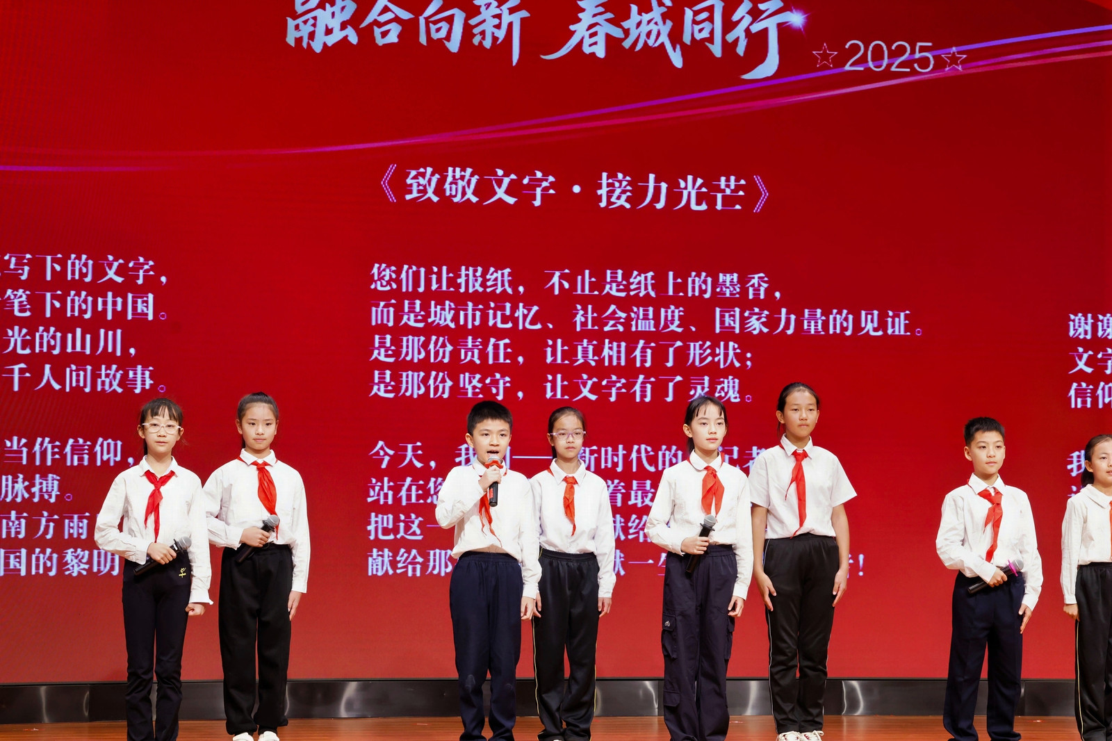 最让我激动的是我们11位小记者一起登台朗诵《致敬文字·接力光芒》的时刻。当我站在台上,用清脆的声音读出那些致敬前辈的语句时,仿佛触摸到了文字背后沉甸甸的力量。更让我惊喜的是,我了解到早在1982年,冰心奶奶就曾为《春城晚报》题字寄语。这一刻,我深深感受到自己正站在一条光辉的传承线上。