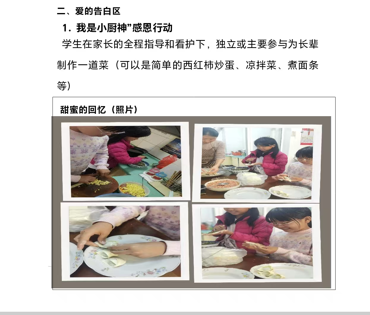 学校鼓励学生将孝心融入日常行动,分年段实践“我是小厨神”和“家史微记录”等活动。学生在家长的指导下为长辈制作一道菜,并用照片记录温馨瞬间;鼓励学生聆听老照片背后的家族故事,并制作成电子或手写相册。活动期望通过这份充满感恩与陪伴的实践,让孝亲敬老的中华传统美德在每一个家庭中生根发芽。并通过后续的主题班会分享实践故事与“家史”点滴,进一步深化活动内涵。