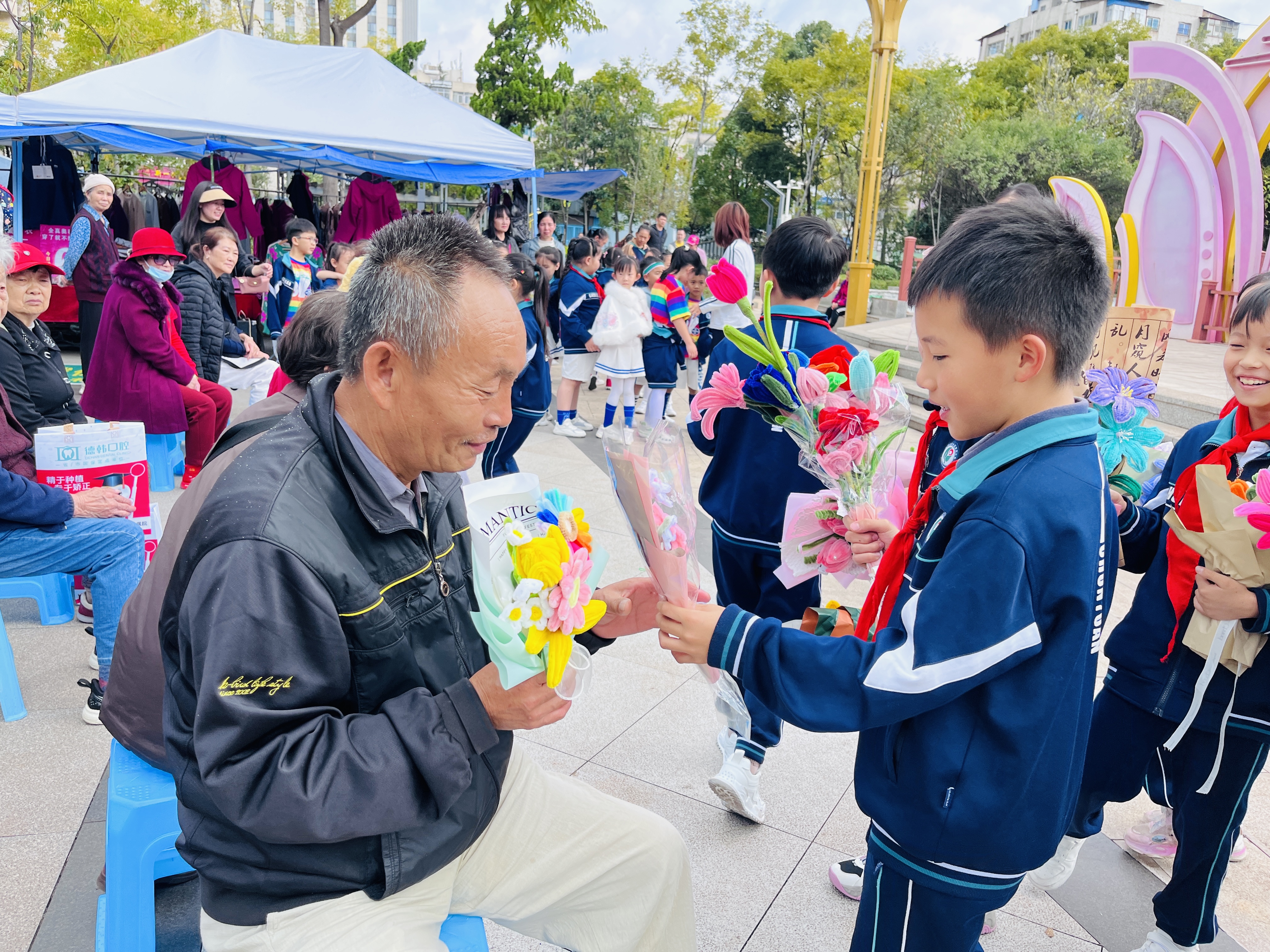 随后,温馨的互动将气氛推向高潮。三、四年级的学生代表们手捧全校同学亲手制作的“感恩扭扭花”,走到爷爷奶奶们身边,恭敬地献上这份独特的心意与节日的问候。老人们接过花朵,脸上洋溢着幸福与感动。