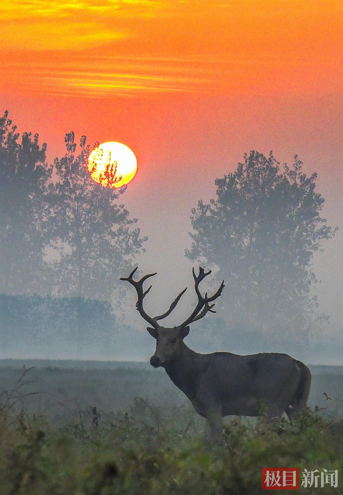 石首麋鹿国家级自然保护区,一头麋鹿在朝阳下觅食。(极目新闻记者 黄志刚 摄)