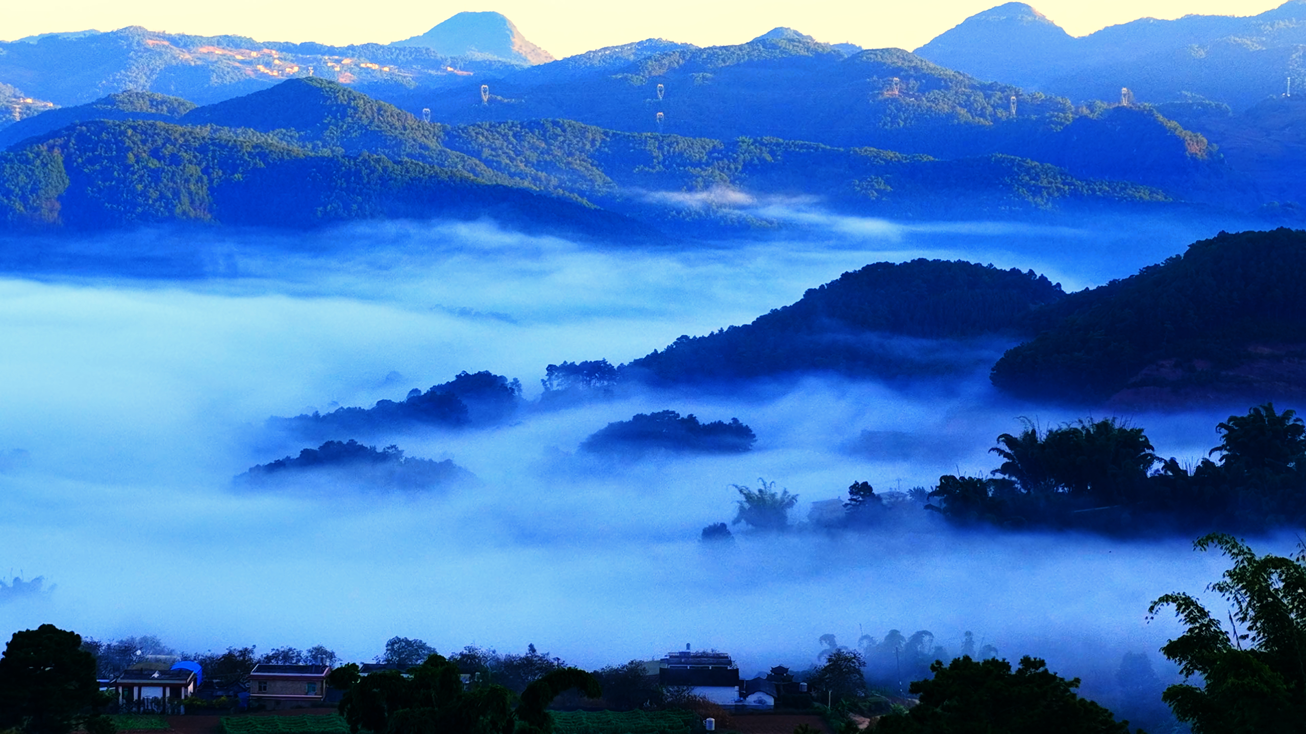 日出前后,翻腾的云海如一条洁白的“银河”,无声地铺满了勐统坝子的千沟万壑。远处山峦的峰顶化作“岛屿”,在云涛中若隐若现,与挺拔在云中的树木共同构成一幅意境深远的水墨画。