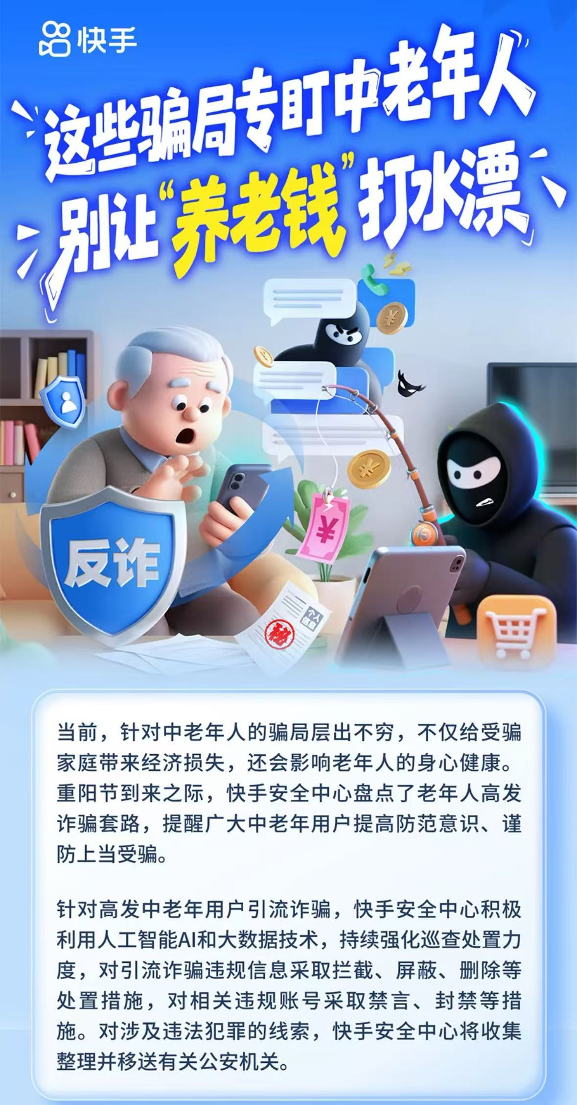 “快手积极利用可灵AI赋能公安反诈宣传,依托‘短视频+直播’产品优势不断创新反诈宣传内容形态。同时,积极利用人工智能AI和大数据技术,持续强化对引流诈骗的打击处置力度。”快手安全中心相关负责人介绍,今年重阳节,快手除了与云南警方、山人乐队联动发布云南山歌反诈版神曲,还重点针对中老年人高发诈骗套路作出风险提示并公布最新引流诈骗治理成果。最近一个月,快手平台累计封禁冒充客服、虚假中奖、虚假上门回收、刷单返利、投资理财等诈骗引流账号44.5万余个,累计拦截高风险语音通话39万次,日均向210余万人次发送管理员反诈通知提示潜在诈骗风险。