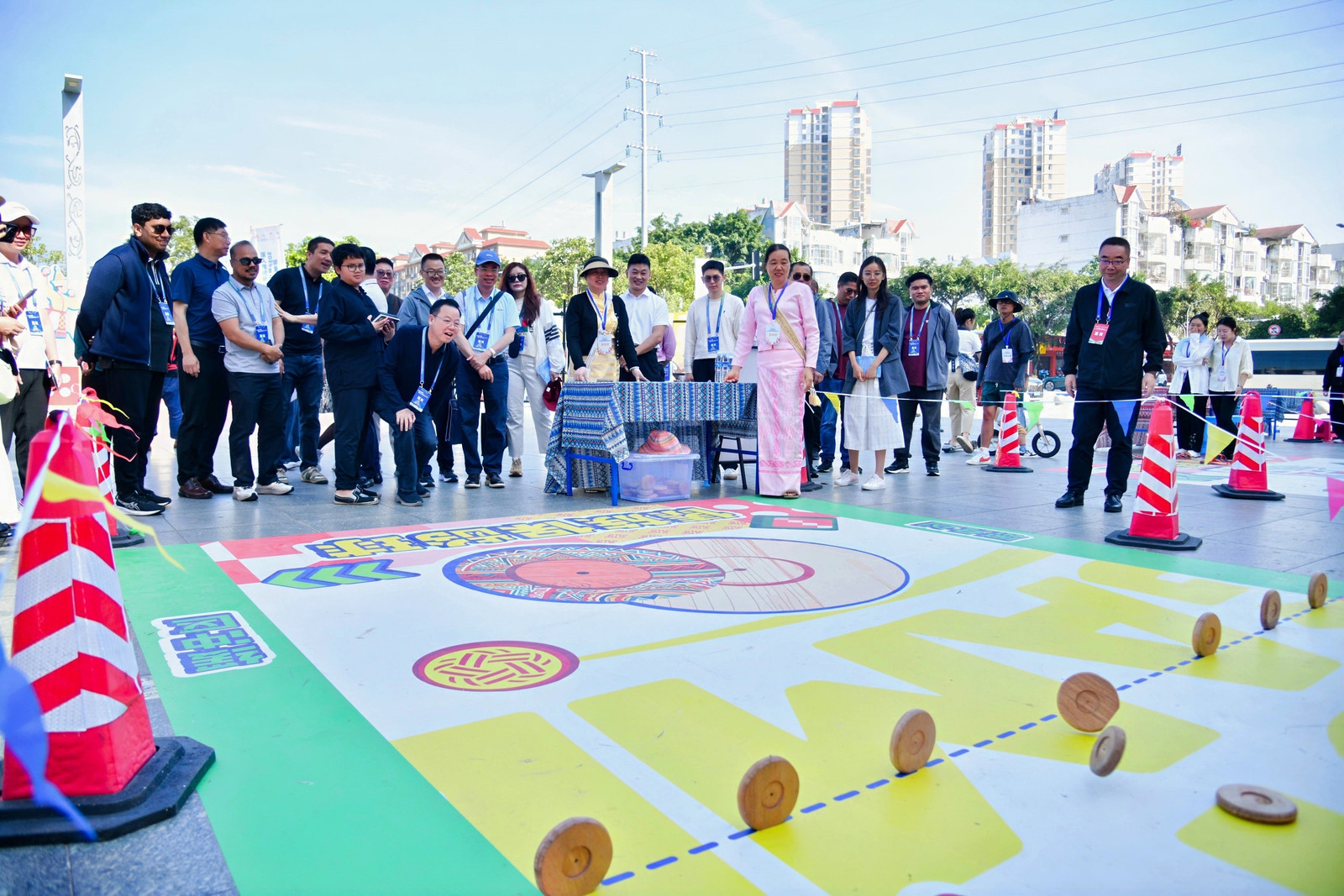 赛事自2024年创办以来,先后汇聚昆明、保山、临沧、西双版纳、缅甸木姐等地队伍、省内高校及德宏5县市近800名运动员同台竞技。与此同时,10月31日上午,应邀前来体验的南亚东南亚多国驻昆外交官也走进活动现场,观摩藤球决赛,并参与民族传统体育项目体验中。在板鞋竞速和傣族保龄球等趣味环节,外交官们与当地民众亲切互动,现场气氛热烈友好。一位外交官在体验后感慨:“体育是最通用的国际语言。在这里,我触摸到了中国边疆开放包容的温度。这种以球会友、以赛传情的民间外交模式,让中国与南亚东南亚国家的友谊之树枝繁叶茂,为构建人类命运共同体注入了体育动能。”