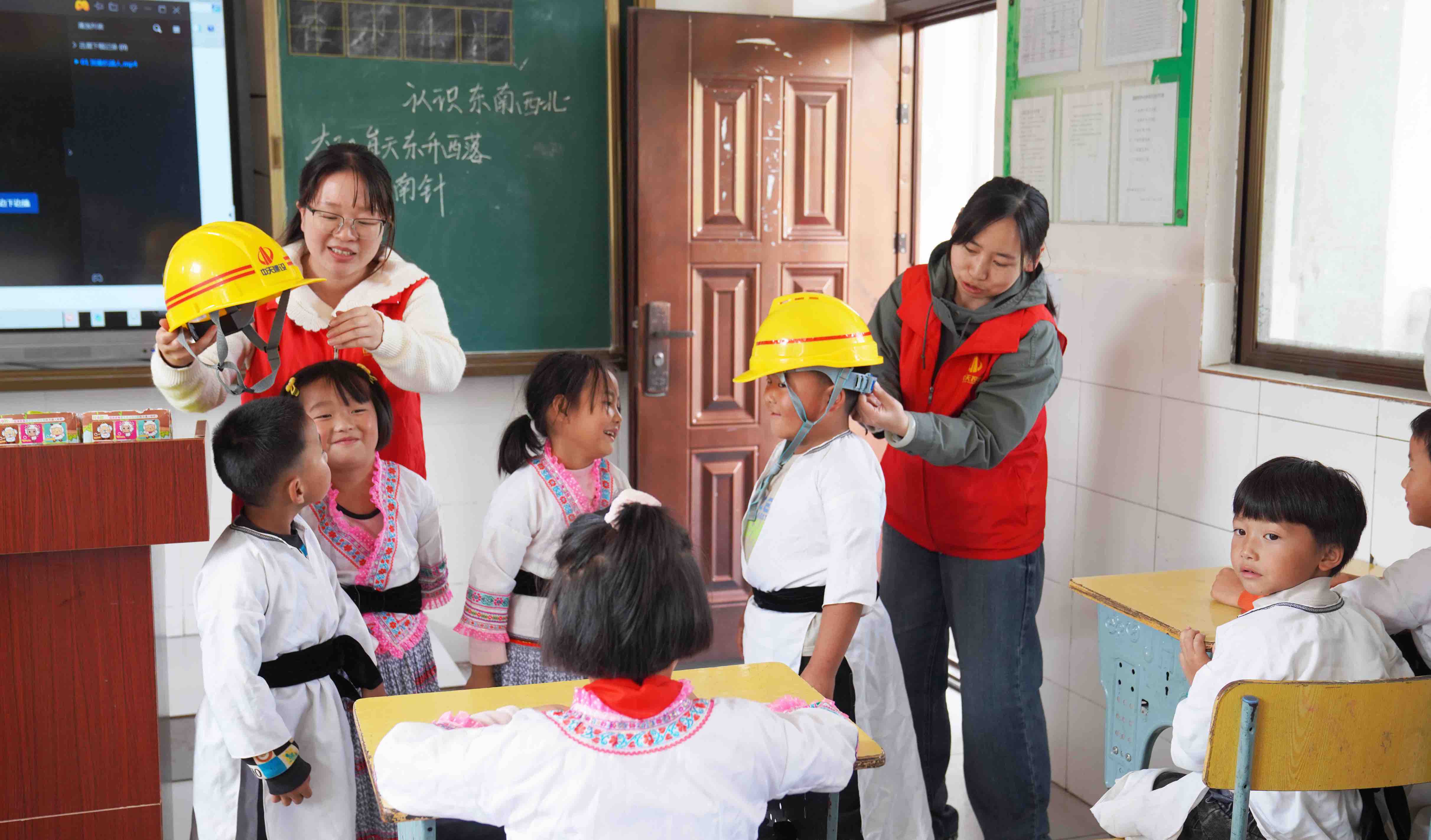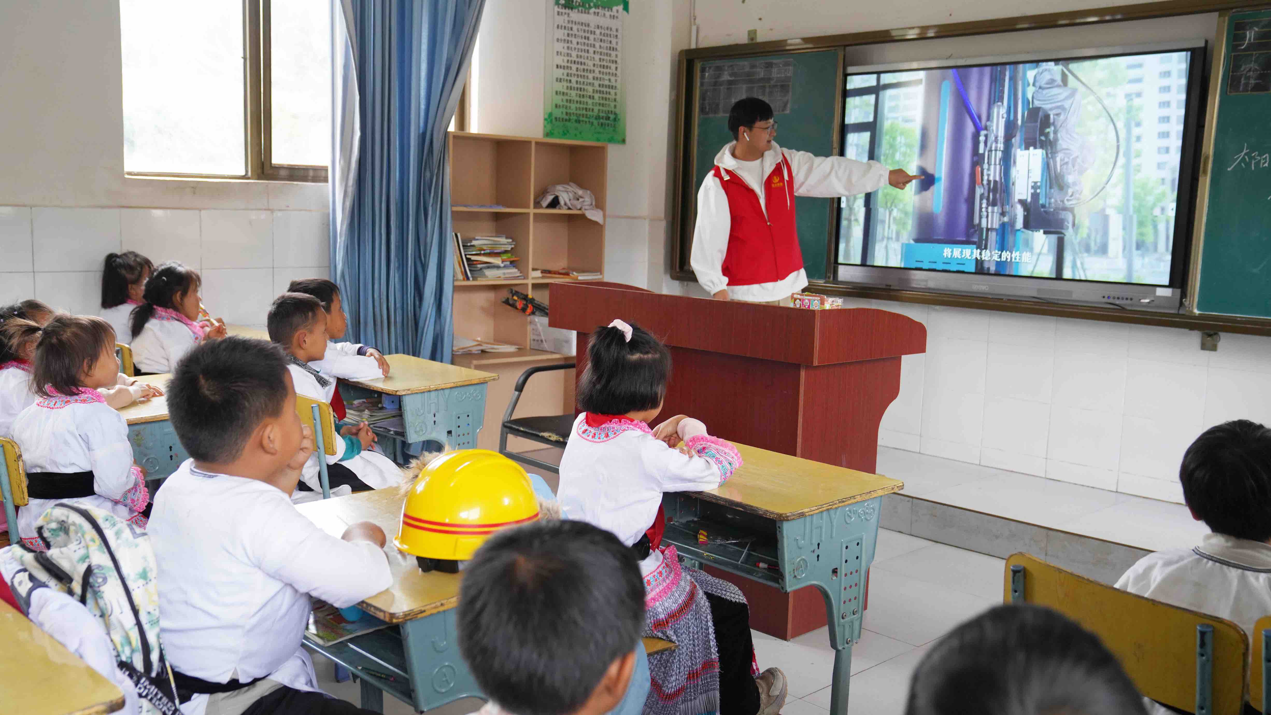 课堂上,志愿者们从安全着手,耐心细致地讲解行人看路、远离戏水、明火电路危险、偶遇陌生人的警惕等日常生活中遇到的场景及应对措施。互动环节,志愿者们结合“建筑工程师”这一职业,讲解了安全帽、反光背心的作用,并指导孩子们正确穿戴这两件“装备”、体验施工现场测量仪器使用方法。