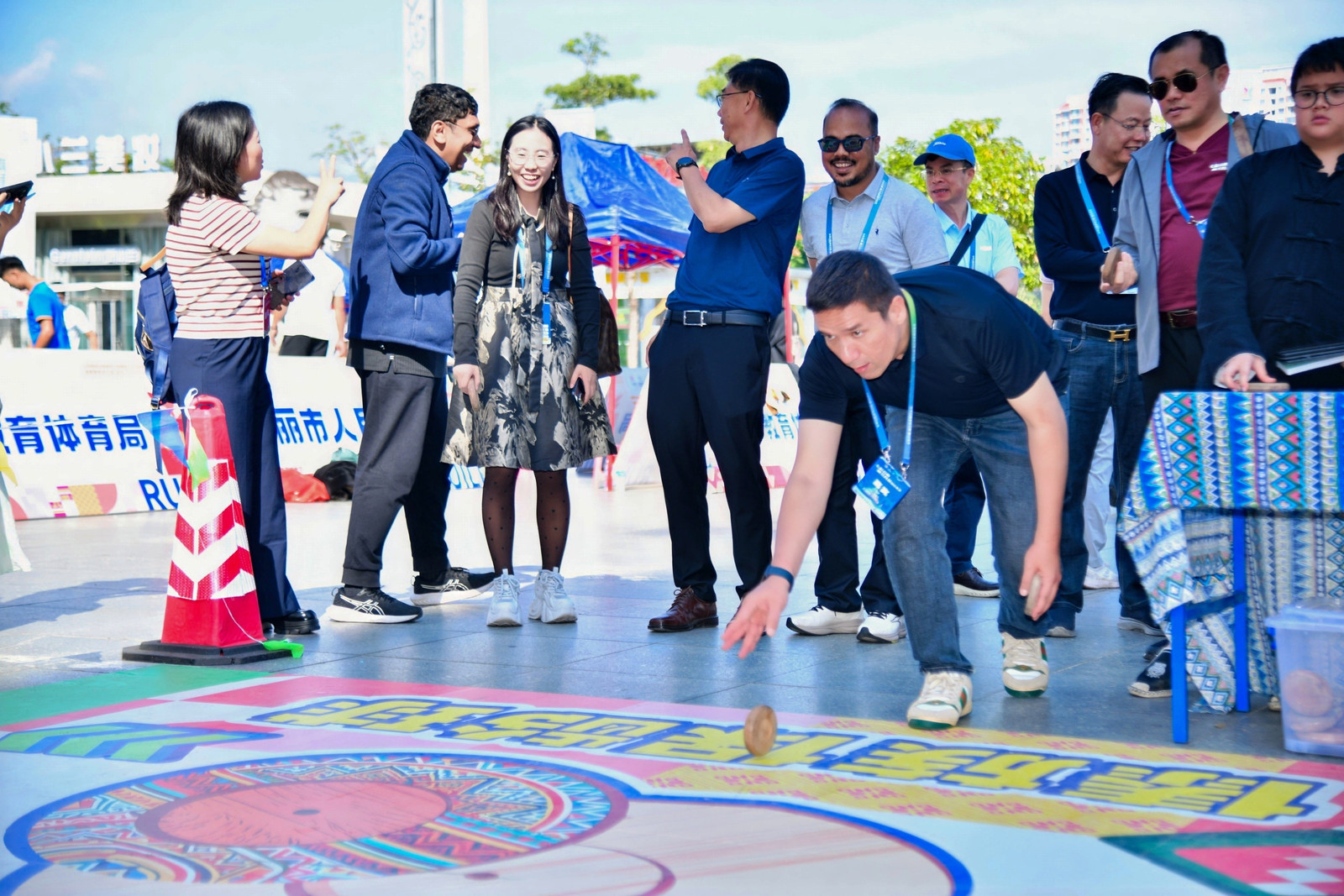 在全民健身边疆行——2025年瑞丽边境少数民族传统体育邀请赛的活动现场,多国使节挑战傣族保龄球,击球声、喝彩声、欢笑声交织,生动展现体育外交的独特魅力。现场还有扭棍、板鞋竞速、蔑弹弓等少数民族传统体育项目也引得外交官们争相体验。缅甸驻昆总领事敦特林先生手持德昂族传统篾弹弓,与当地运动员共同展示狩猎技巧。弓弦轻响间精准命中目标,引来阵阵掌声。马来西亚总领事穆罕默德·阿克玛在体验后表示:“这些充满智慧的传统项目,正是体育外交的独特魅力。”