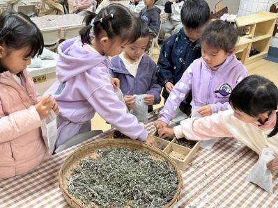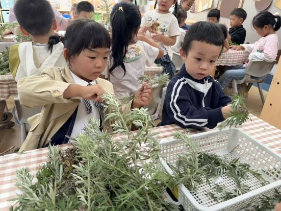 活动伊始,孩子们在老师的带领下,来到了幼儿园的屋顶农场,这里亲手栽种的艾草长得正盛。孩子们小心翼翼地采摘下嫩绿的艾叶,每一片叶子上都仿佛挂着阳光和露珠。老师希望通过这个环节,让孩子们知道,这份礼物从源头就饱含着他们的劳动和期待。艾草有温经祛湿的功效,制作成泡脚包再合适不过。