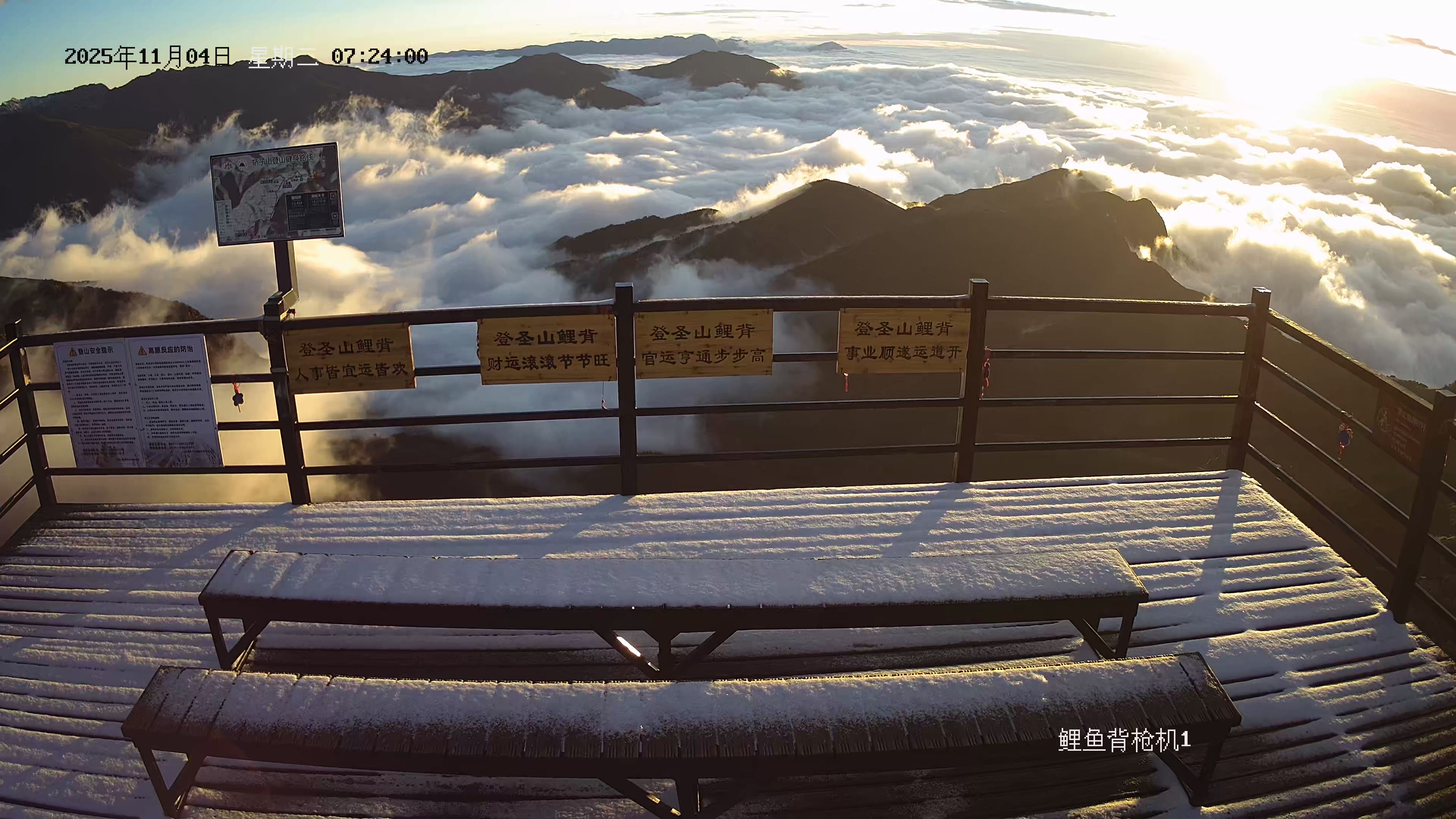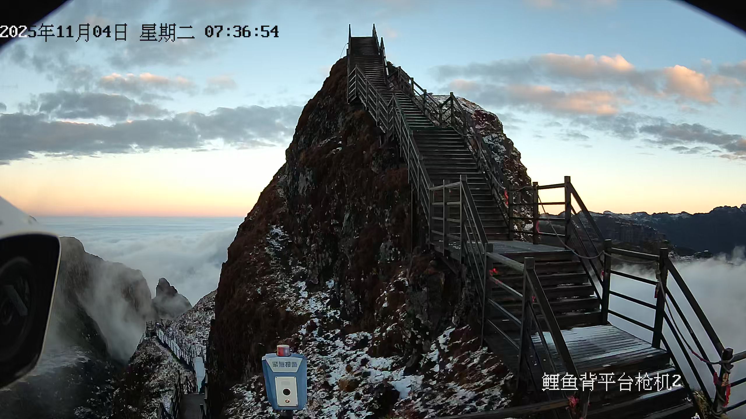 景区监控视频显示,降雪过后,轿顶观景台等地覆盖上一层薄薄的白色积雪,山色空蒙,景致别样。至11月4日清晨7时许,轿顶区域在持续低温下,首场积雪得以保留。天际泛起金色霞光,与翻涌的云海、洁白的积雪交相辉映,形成“晨光、云海、冰雪”同框的美妙景象。