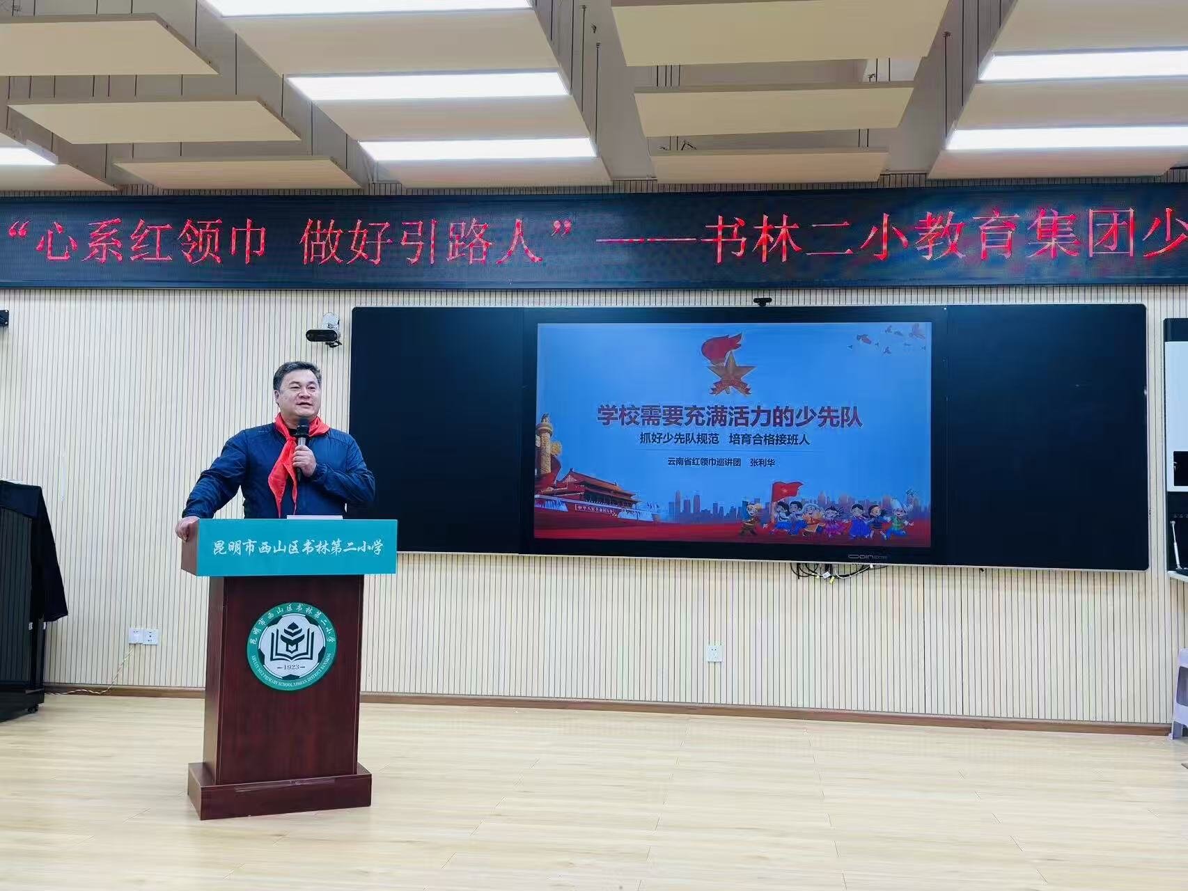 10月29日下午,西山区书林二小教育集团组织开展“心系红领巾 做好引路人”少先队辅导员培训,特邀昆明市少工委副主任、昆明市少先队副总辅导员、西山区少先队总辅导员、中央民族大学附属中学昆明西山实验小学副校长张利华主讲。书林二小教育集团书林、西苑两校区青年辅导员和镇沅县部分教师全程参与培训。