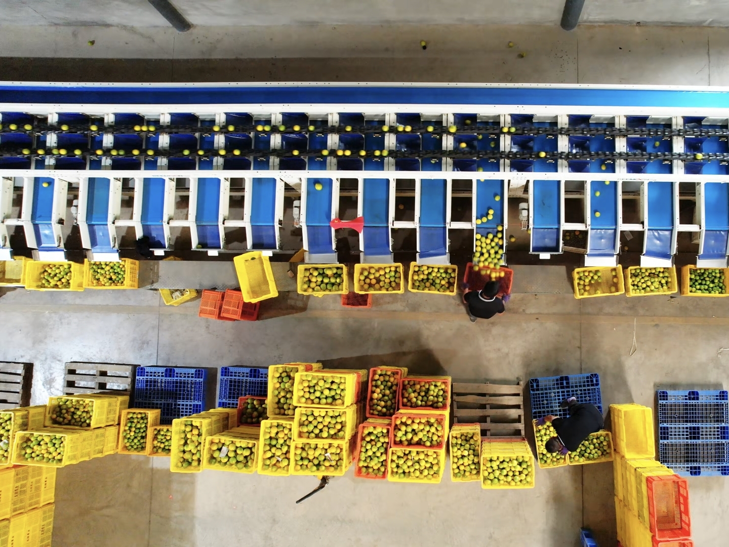 走进选果厂车间,现代化气息扑面而来。3条高速智能分拣线正高速运转,刚采摘的龙橙经预清洗、分选包装后,依次进入分选环节:三维视觉成像技术0.1秒内完成外观检测,近红外设备精准测定糖度,重量传感器精度达1克,果径分拣精确到毫米。“以前靠人工分选,一天最多处理几十吨,现在每条线日处理能力达200吨,效率提升10倍以上。”龙橙果业生产负责人指着屏幕上的实时数据介绍,“今年我们1200亩基地预计产出4500吨冰糖橙,全靠这套设备实现标准化分级。”