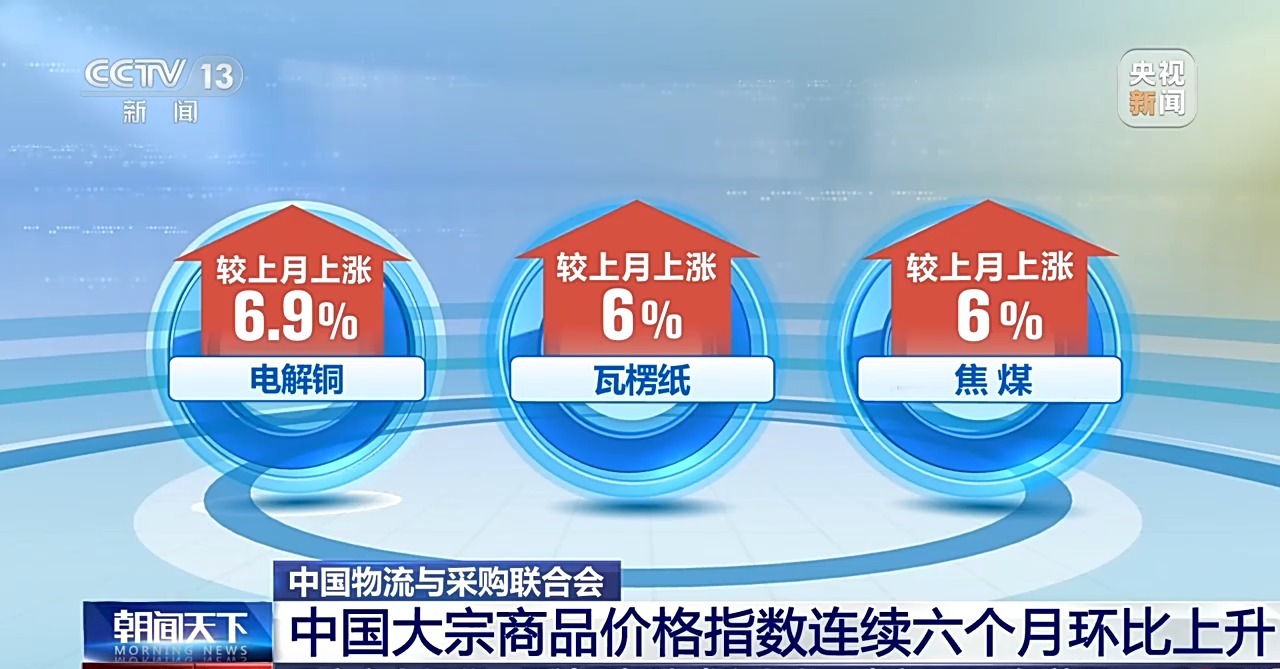 中国物流与采购联合会今天(5日)公布10月份中国大宗商品价格指数。从指数运行情况看,连续六个月实现环比上升,且涨幅较上月明显扩大。表明随着国家稳增长等一系列政策效能持续释放,以及国际贸易紧张局势有所缓和,企业信心进一步增强、大宗商品市场景气水平继续回升。