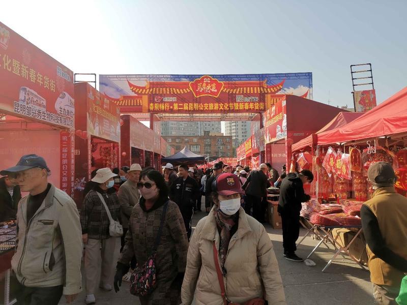 1月31日上午10点,第二届昆明公交“春乘畅行”惠民活动暨新春年货街在小西门潘家湾公交车场开幕。活动现场,牛干巴、三七鲜花饼、手工糖、腊肠、泡梨、野生菌等商品琳琅满目,云南特产香气四溢,年味美食暖心暖胃。这场为期15天的活动为市民游客呈现了一场集“好吃、好玩、好逛、好看、便民”于一体的沉浸式年味盛宴。
